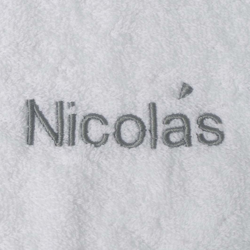 Babete de rizo em cor lisa personalizado com o nome bordado em letra estilo Helvética minúscula com inicial maiúscula.
