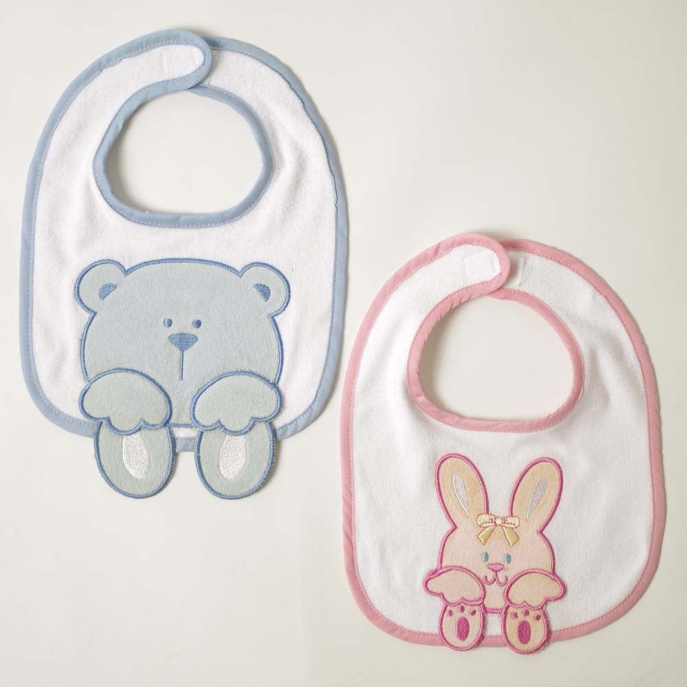 Conjunto de 2 babetes bebé em felpo e aplique fantasia bordado.