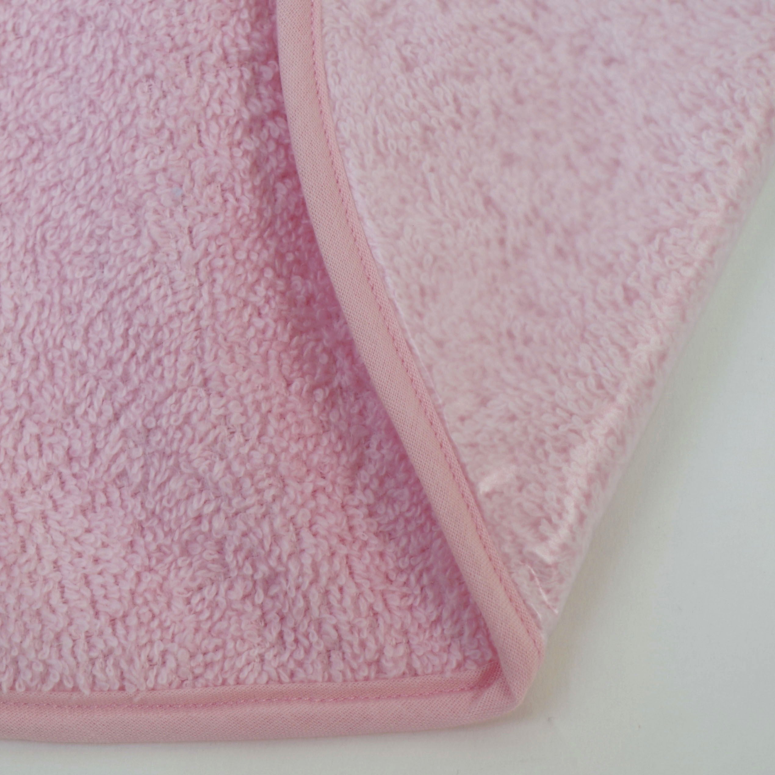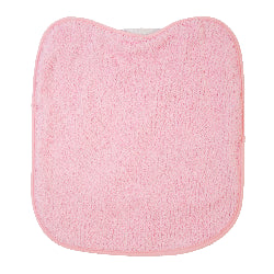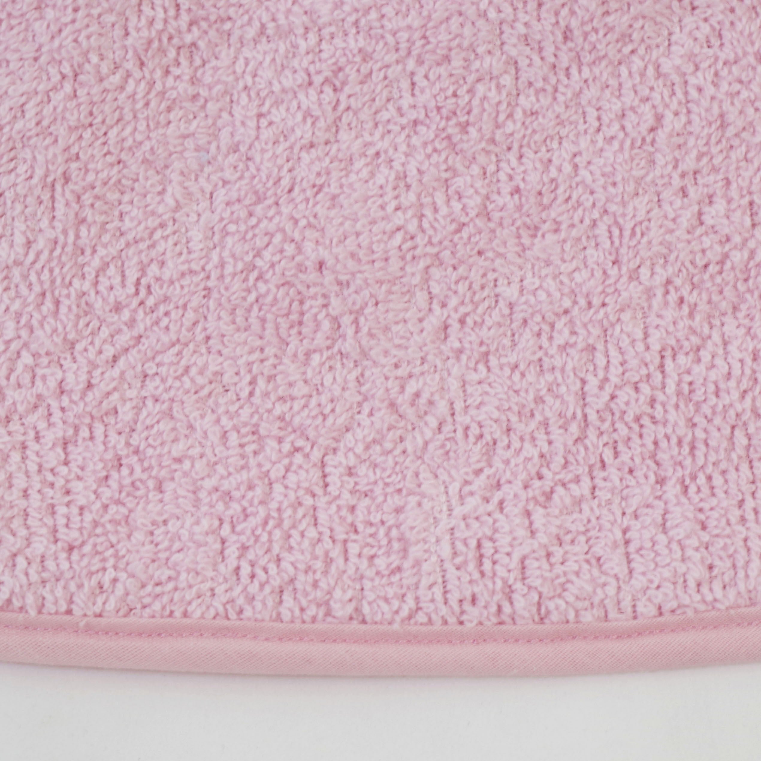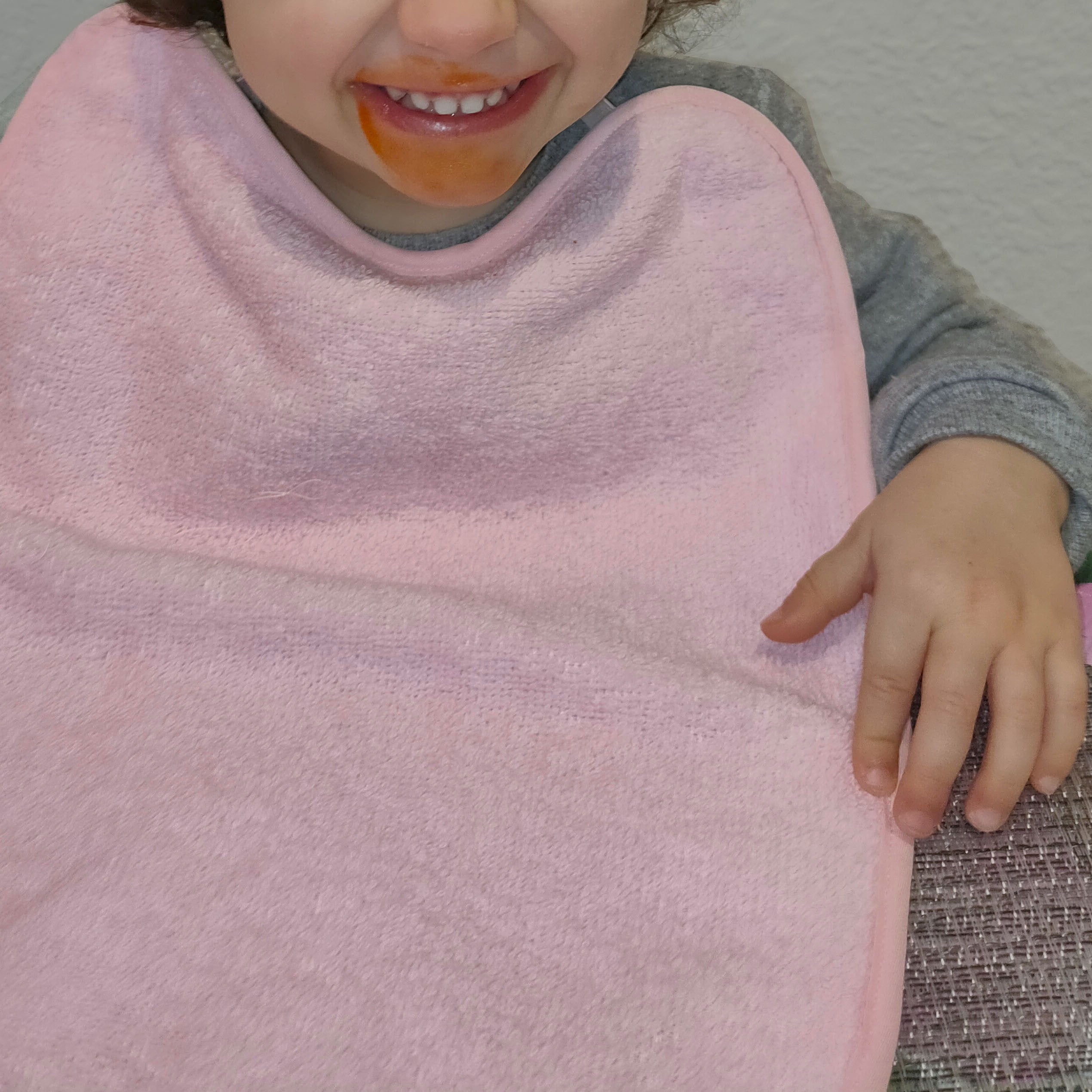 Babete em tecido felpudo rosa, costas de plástico e elástico à volta do pescoço.