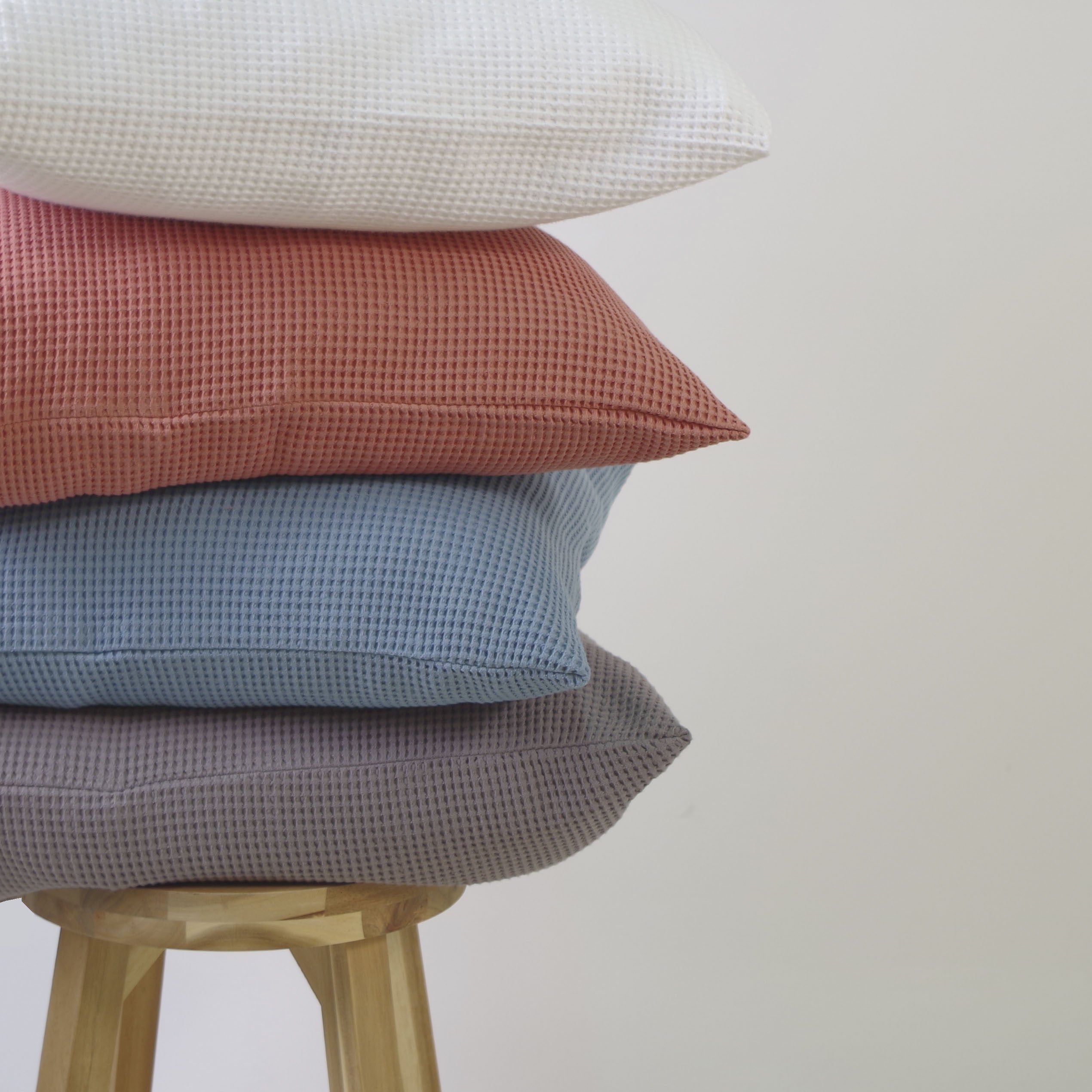 Capa de almofada em tecido favo de mel 100% algodão. Tem as cores perfeitas para vestir a sua casa nos momentos de calor, quando se recomenda o uso de cores frescas e claras. Tecido com acabamento lavado que lhe confere maciez e um aspecto natural e agradável.