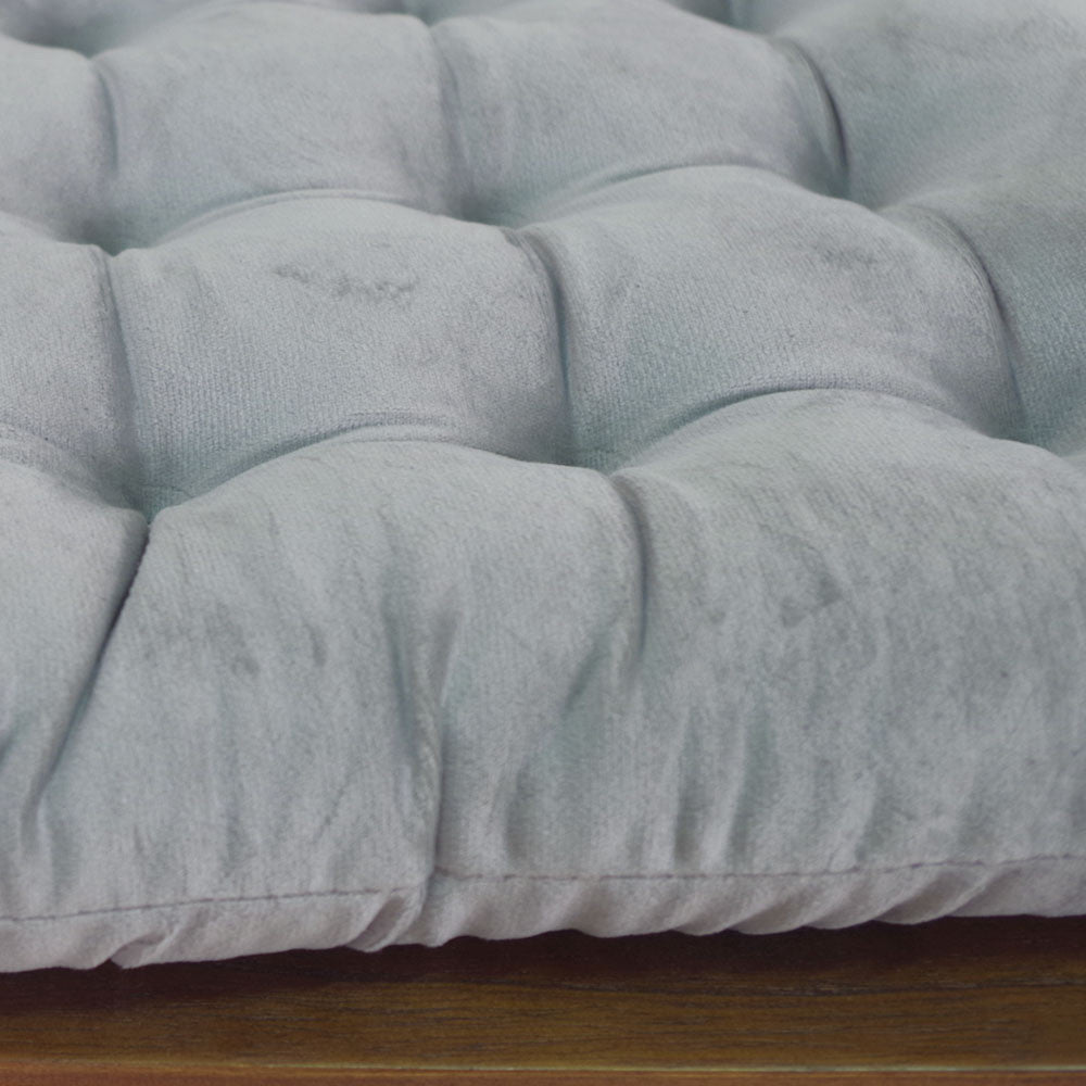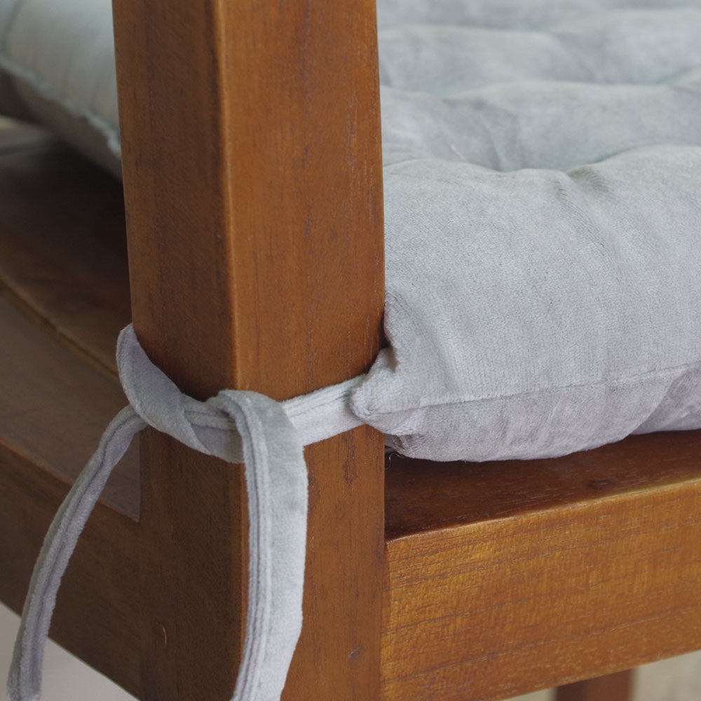 Sua construção em veludo 100% poliéster garante alta durabilidade e seu enchimento em fibra proporciona o conforto que você procura. Além disso, possuem amarrações nos cantos que permitem fixá-los nas cadeiras.