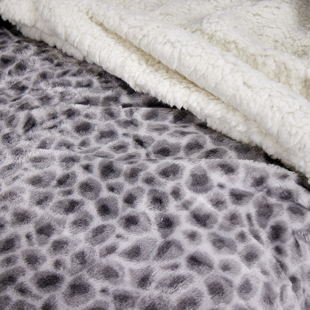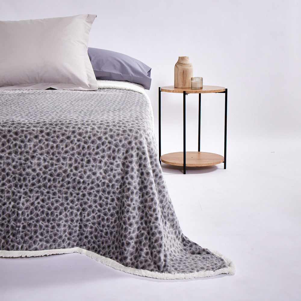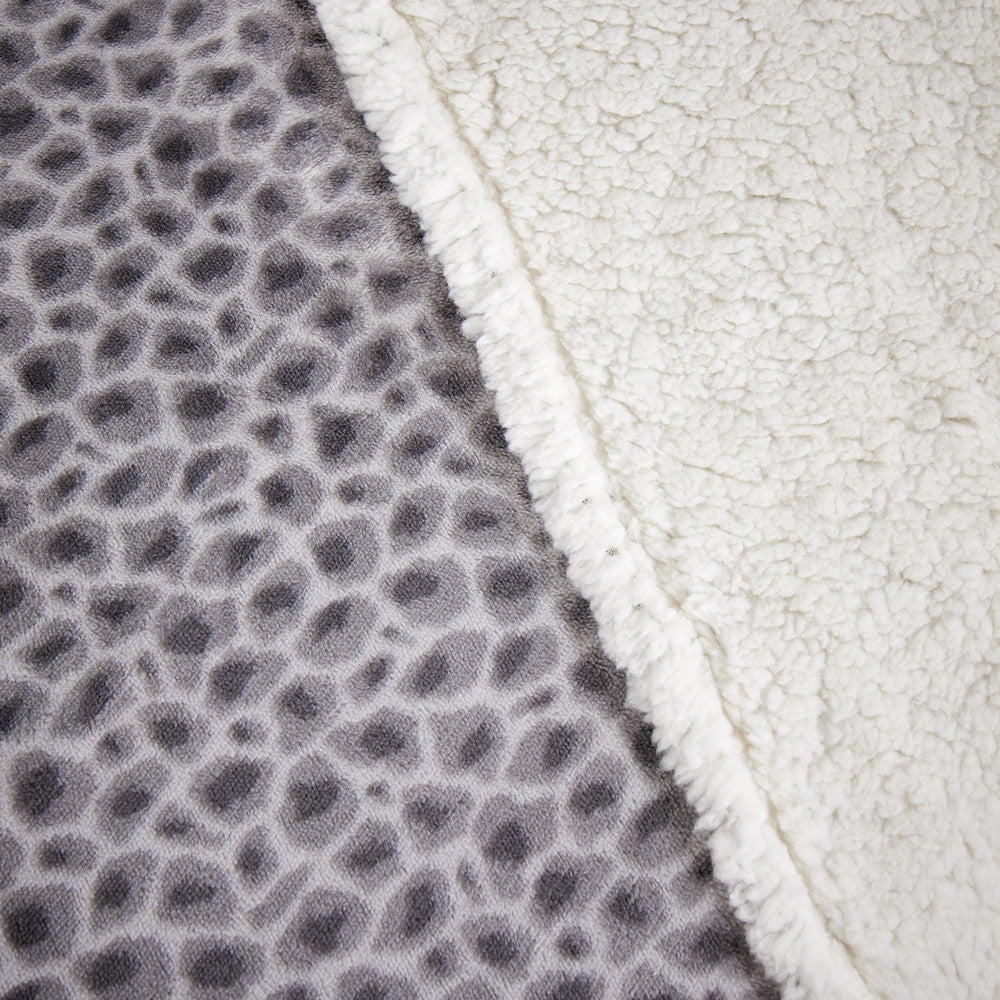 Manta de sedalina estampada com padrão animal e reverso de borreguito branco.