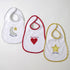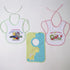 Conjunto de três babetes plastificados com estampados diferentes e ribeteados.