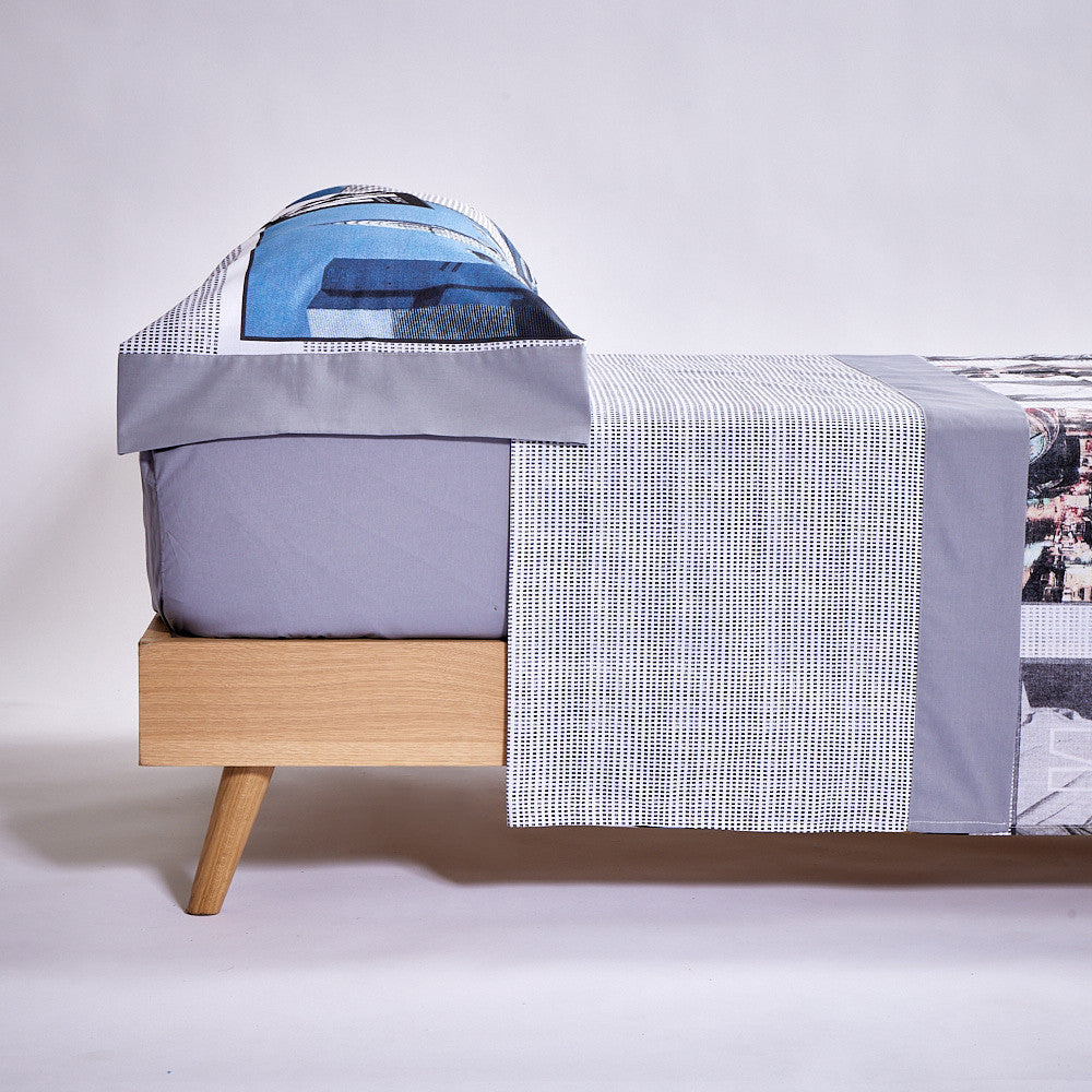 O lençol ajustável é de cor lisa, em harmonia com o estampado.