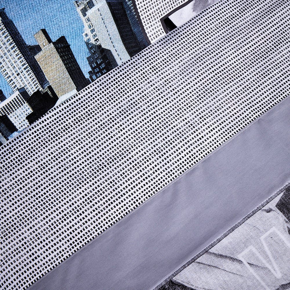 O conjunto é composto por um lençol superior estampado, um lençol ajustável liso e uma fronha estampada com duas aberturas.