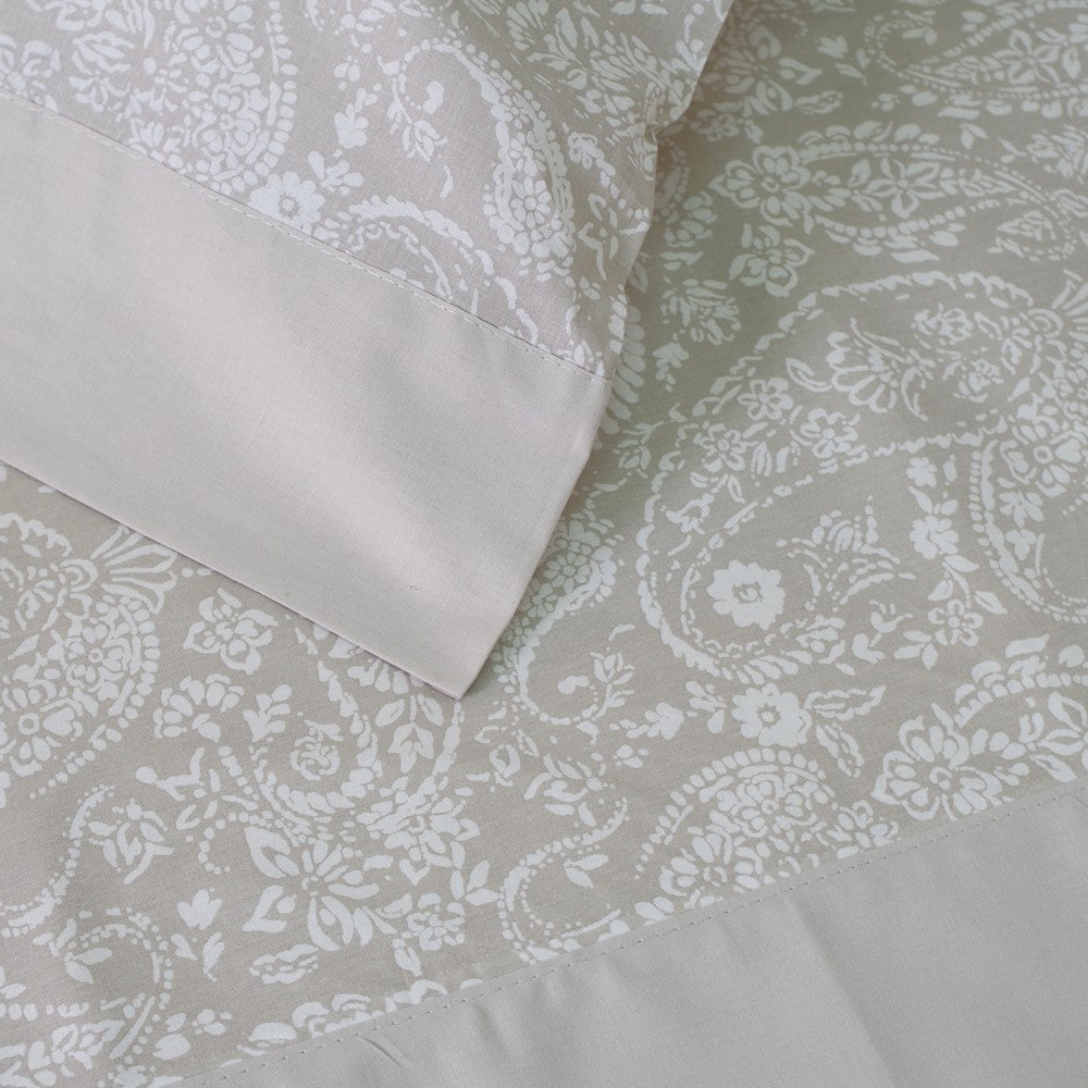 Jogo de lençóis estampado composto por três peças: Lençol de cima, lençol de baixo ajustável e capa de almofada.