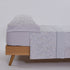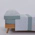 O conjunto é composto por uma bancada, um lençol de baixo adaptável (para colchões de até 30 cm de altura e 190/200 cm de comprimento) e uma fronha com duas aberturas.