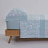 O conjunto é composto por um top, um lençol de baixo adaptável (para colchões até 30cm de altura e 190/200cm de comprimento) e uma fronha com duas aberturas.