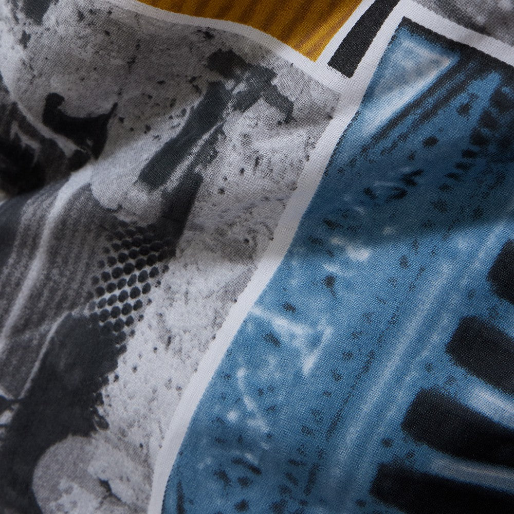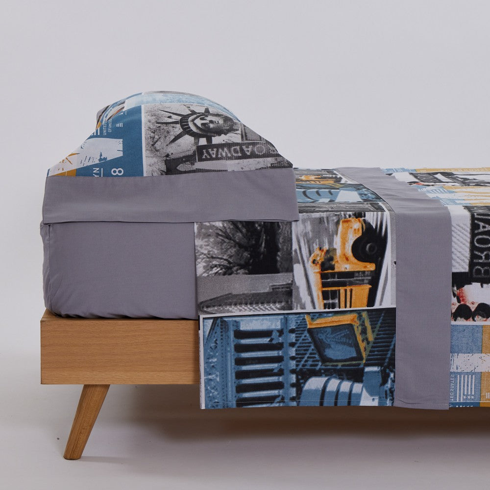 O conjunto é composto por lençol superior estampado, lençol ajustável liso e fronha estampada com duas aberturas.