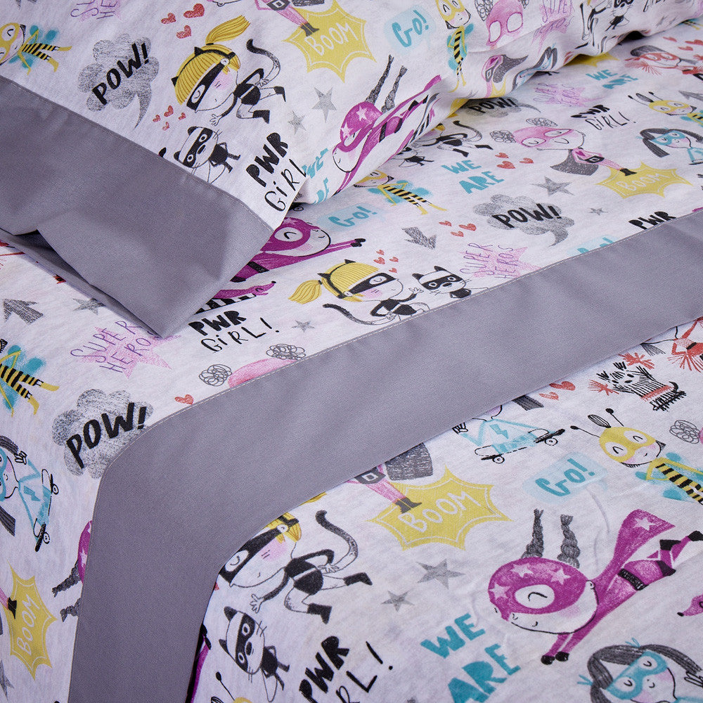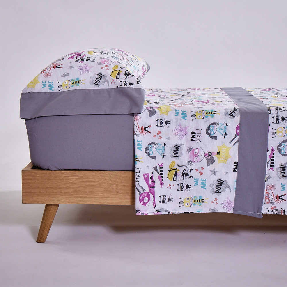 O conjunto é composto por lençol de cima, lençol ajustável e fronha com duas aberturas.