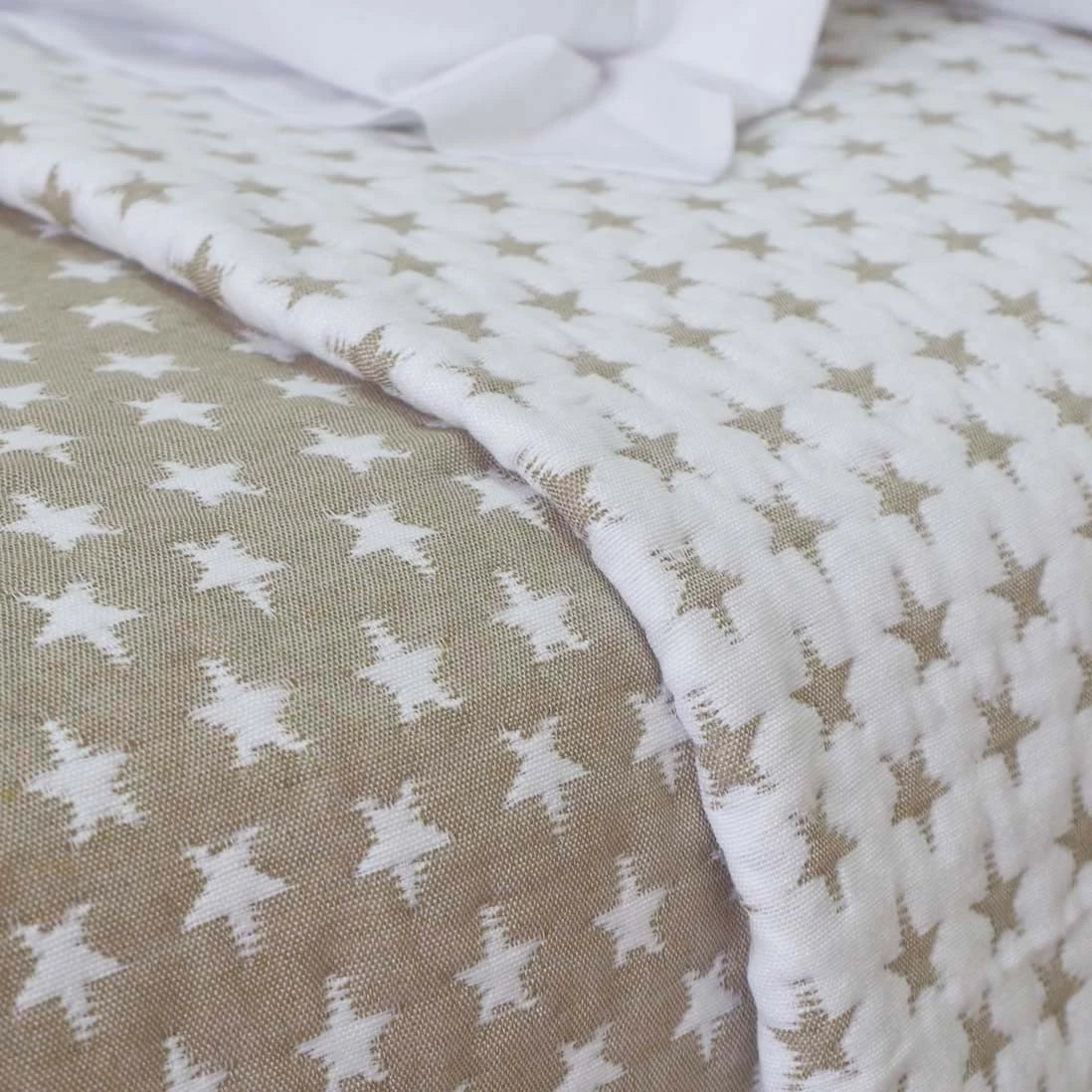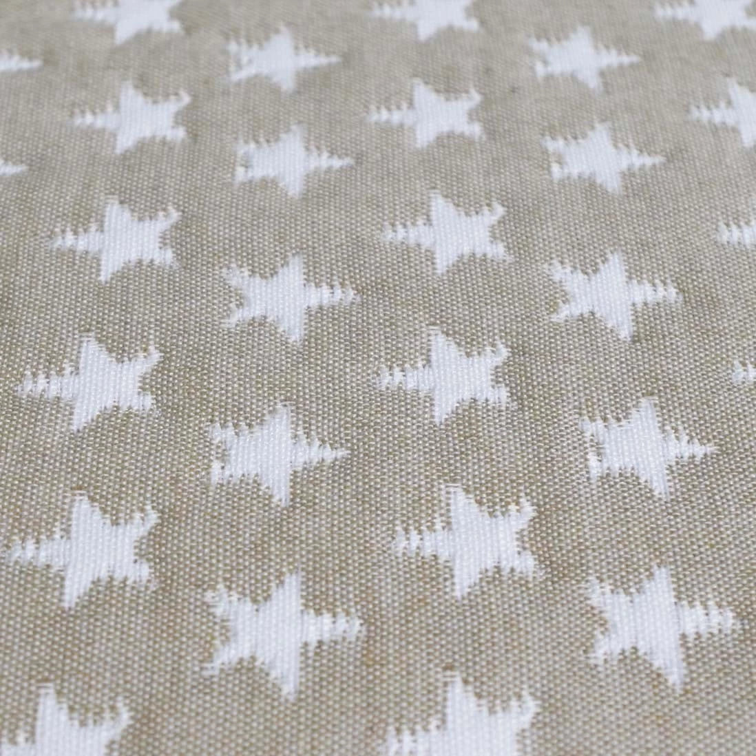 Tecido trançado em jacquard com estrelas e reverso em negativo, o que permite que seja reversível.