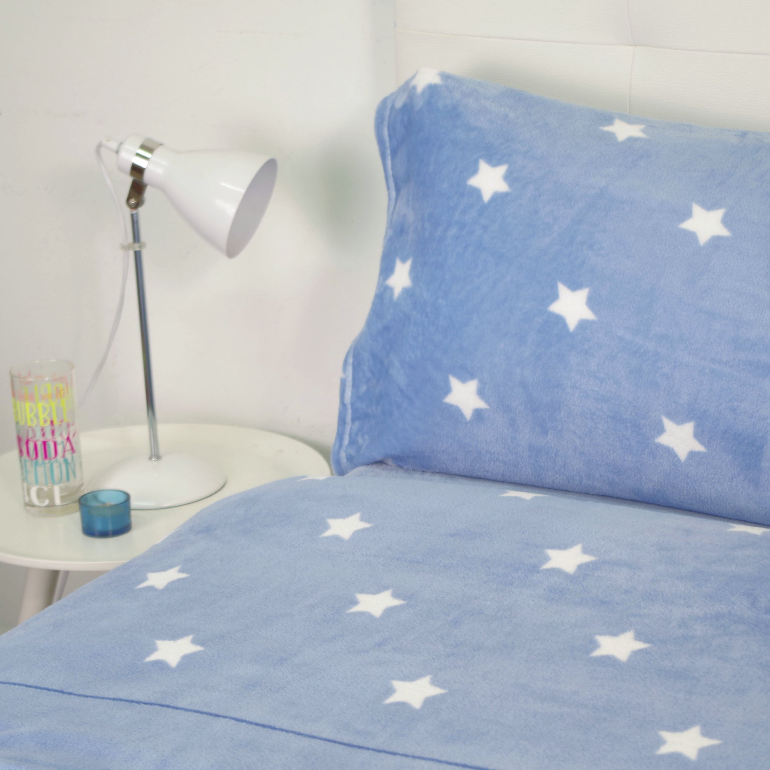 O conjunto é composto por lençol de cima, lençol de baixo adaptável com elástico em toda a volta, e fronha com duas aberturas.