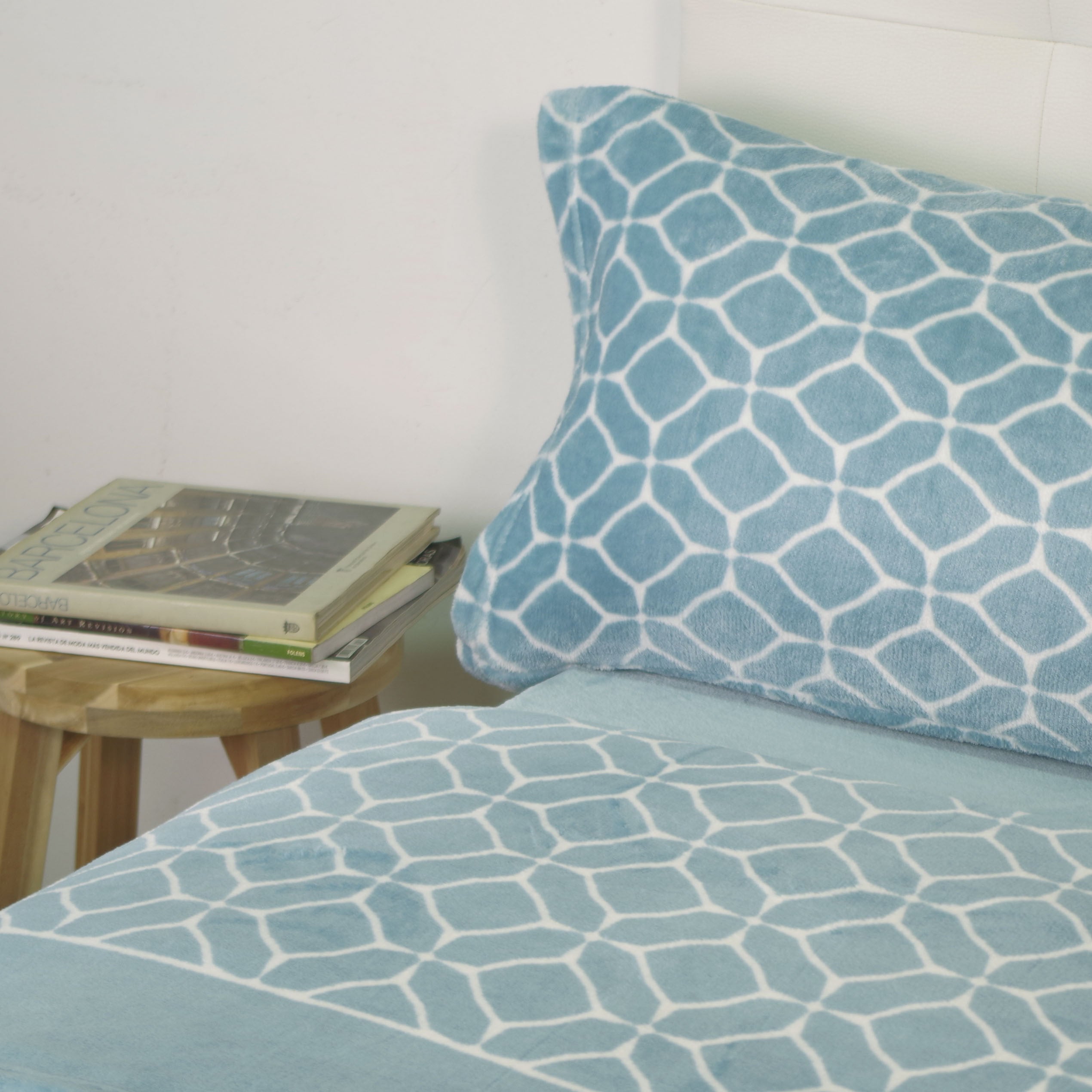 O conjunto é composto por lençol de cima, lençol de baixo adaptável com elástico em toda a volta, e fronha com duas aberturas.