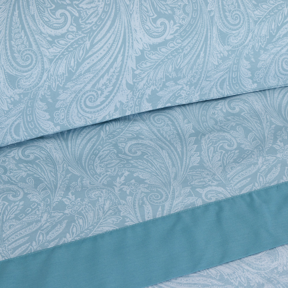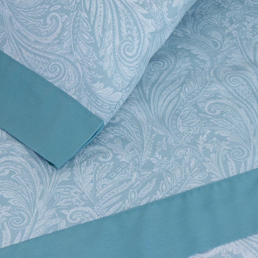 O lençol com elástico é de uma cor sólida que combina com o estampado.