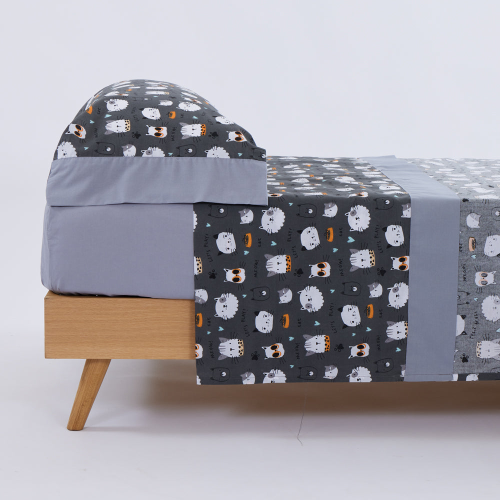 O conjunto é composto por um lençol de cima estampado, um lençol de baixo liso com elástico e uma fronha estampada com duas aberturas.
