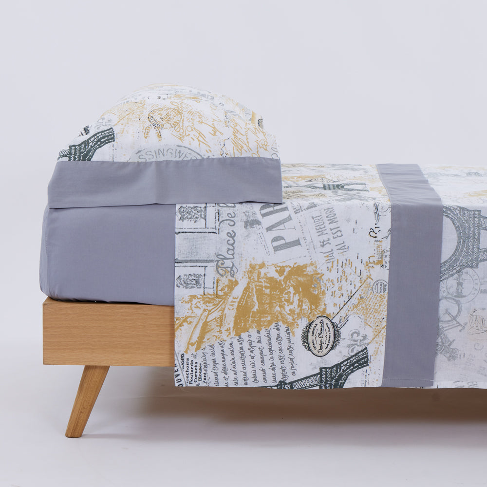 Um conjunto completo de lençóis para decorar a sua cama por completo e dar ao seu quarto um ar completamente renovado. Com um fundo liso e uma parte superior estampada, este conjunto de lençóis combina na perfeição com quartos de cores quentes, escuras ou vibrantes.