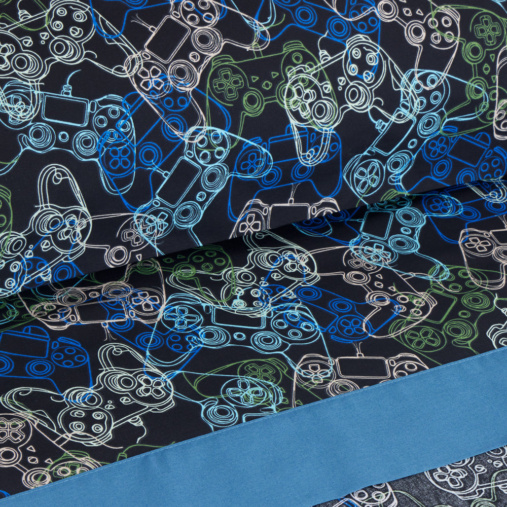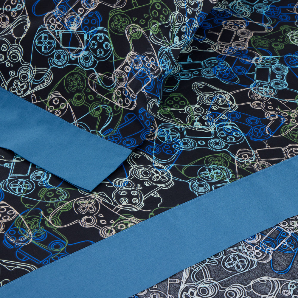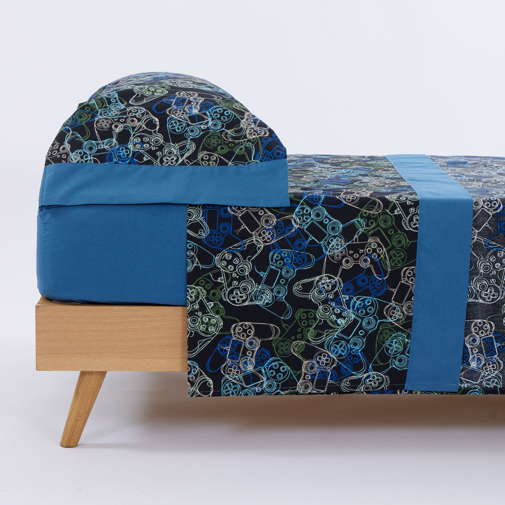 O lençol com elástico é de uma cor sólida que combina com o estampado.