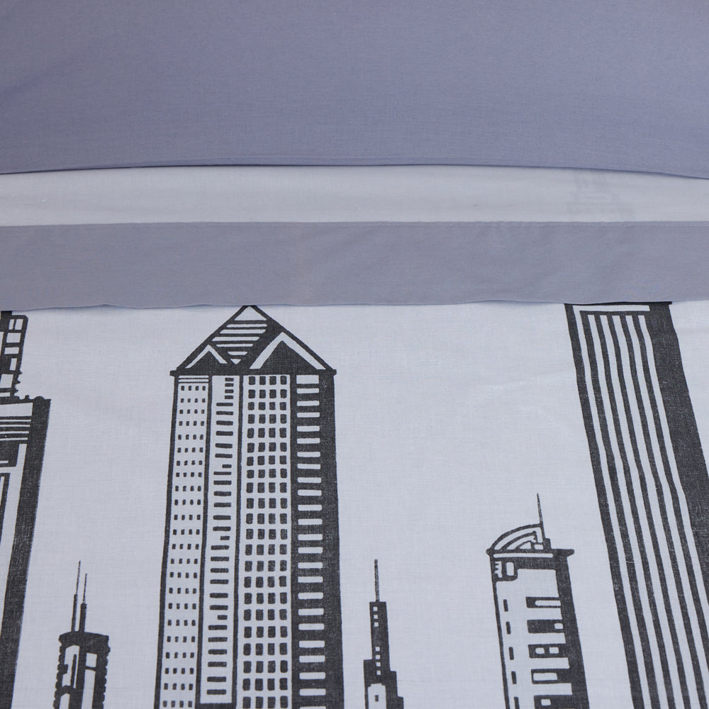 O conjunto é composto por um lençol de cima estampado, um lençol de baixo liso com elástico e uma fronha estampada com duas aberturas.