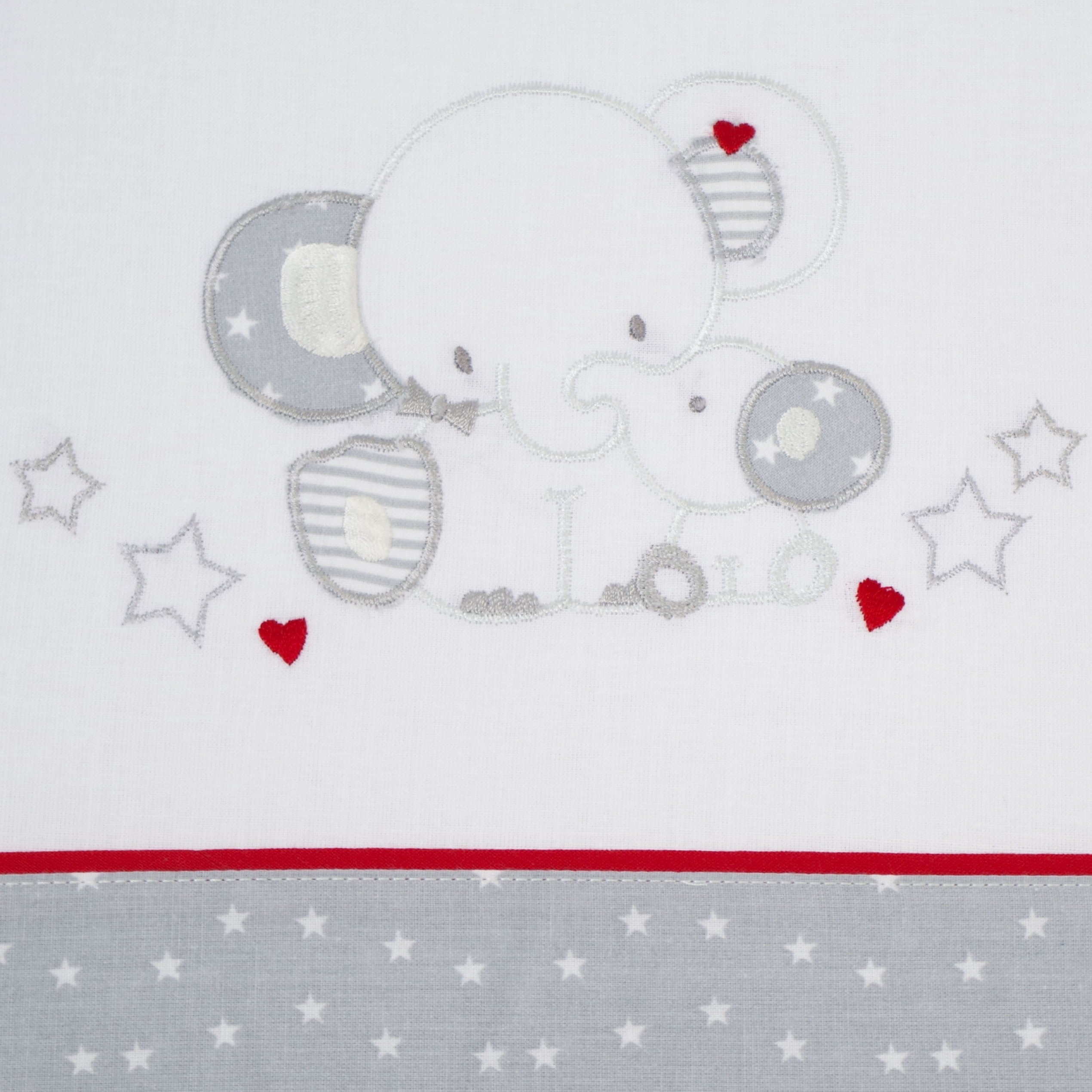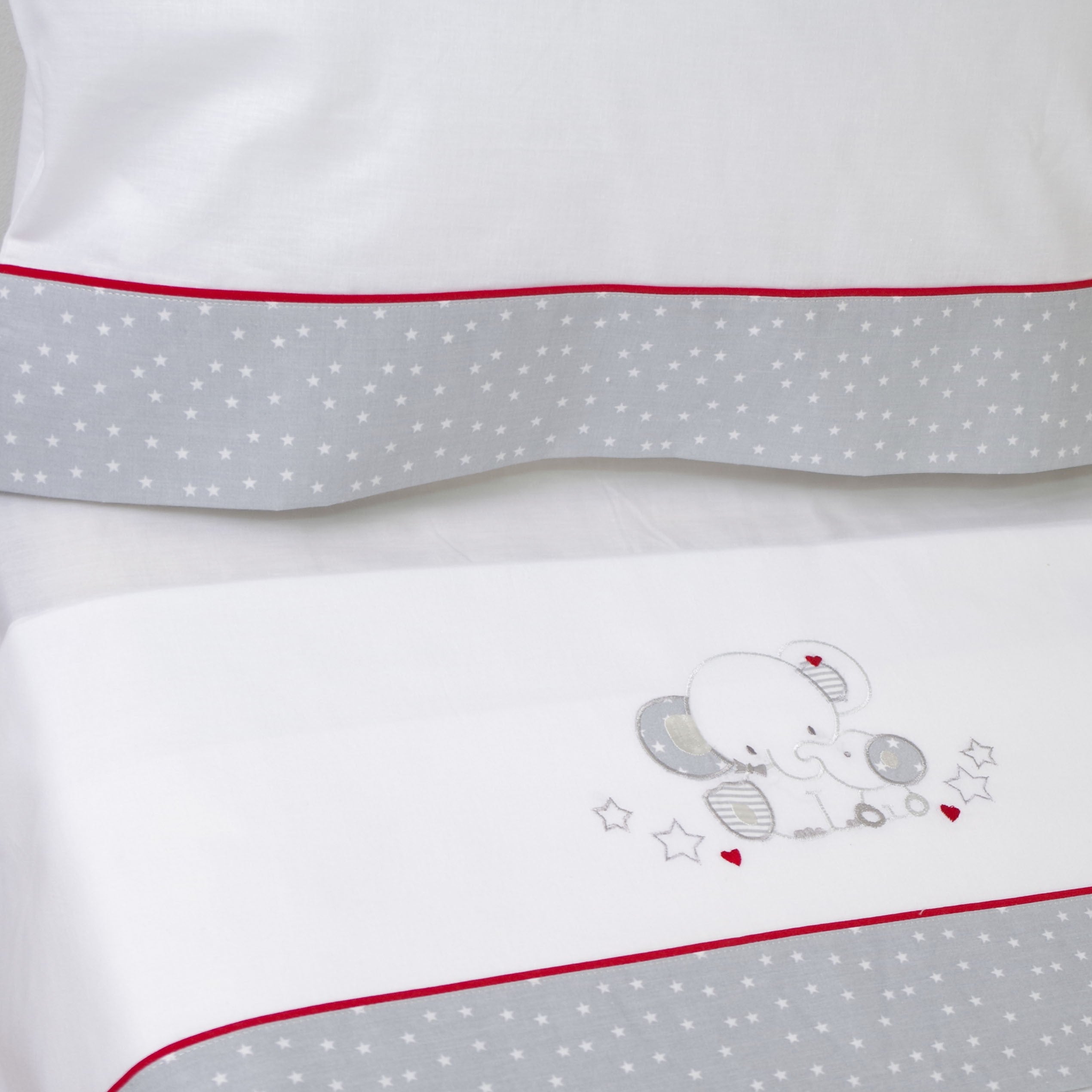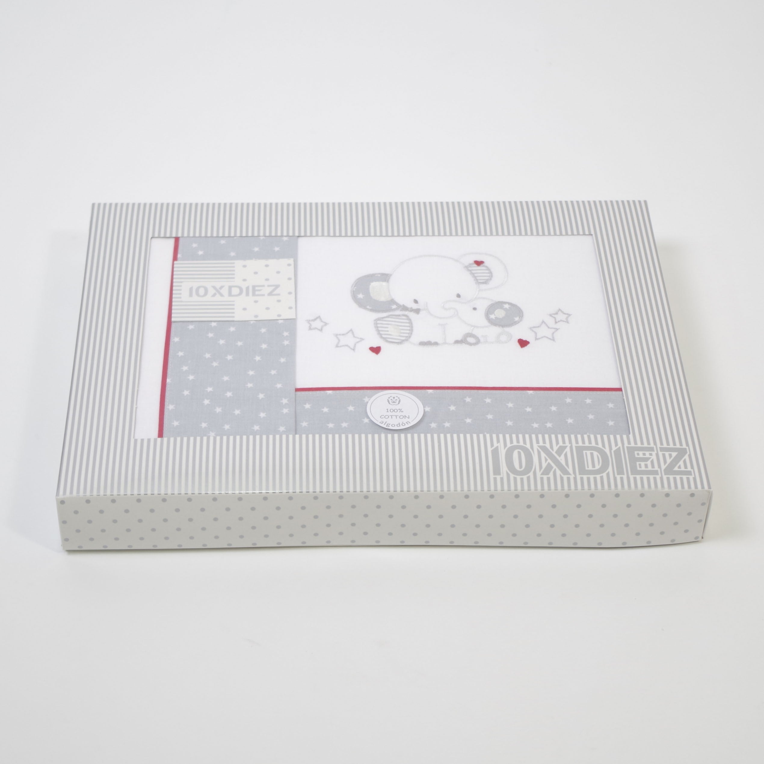 Conjunto de três peças para berço de bebé em algodão 100% com desenho bordado, disponível em várias cores.