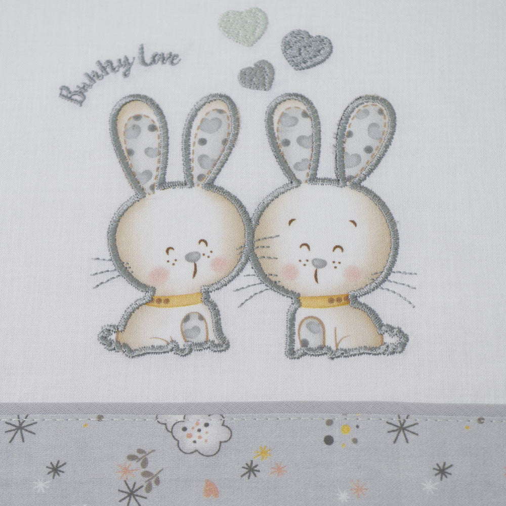Conjunto de três peças para berço de bebé com desenho bordado, disponível em várias cores.