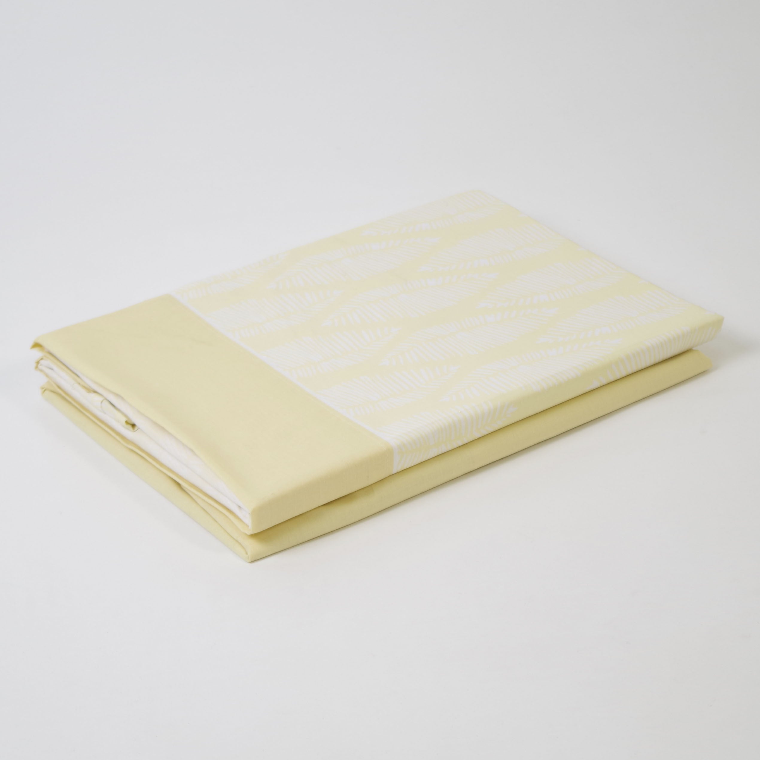 O conjunto é composto por lençol de cima, lençol ajustável, e fronha com duas aberturas.