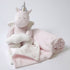 Manta de 80 cm de largura x 75 cm de comprimento em cor rosa com estampado de nuvens em cor prata.
