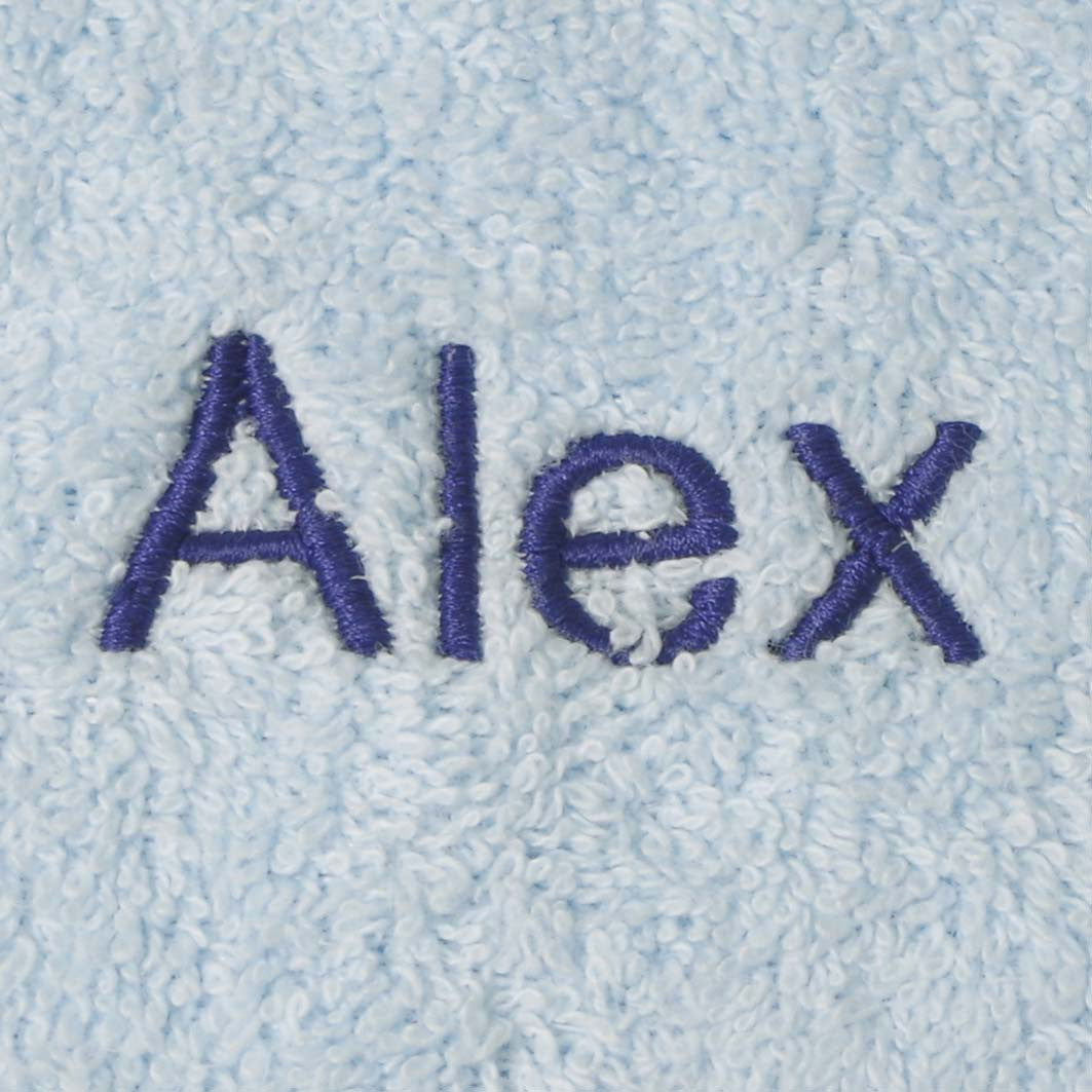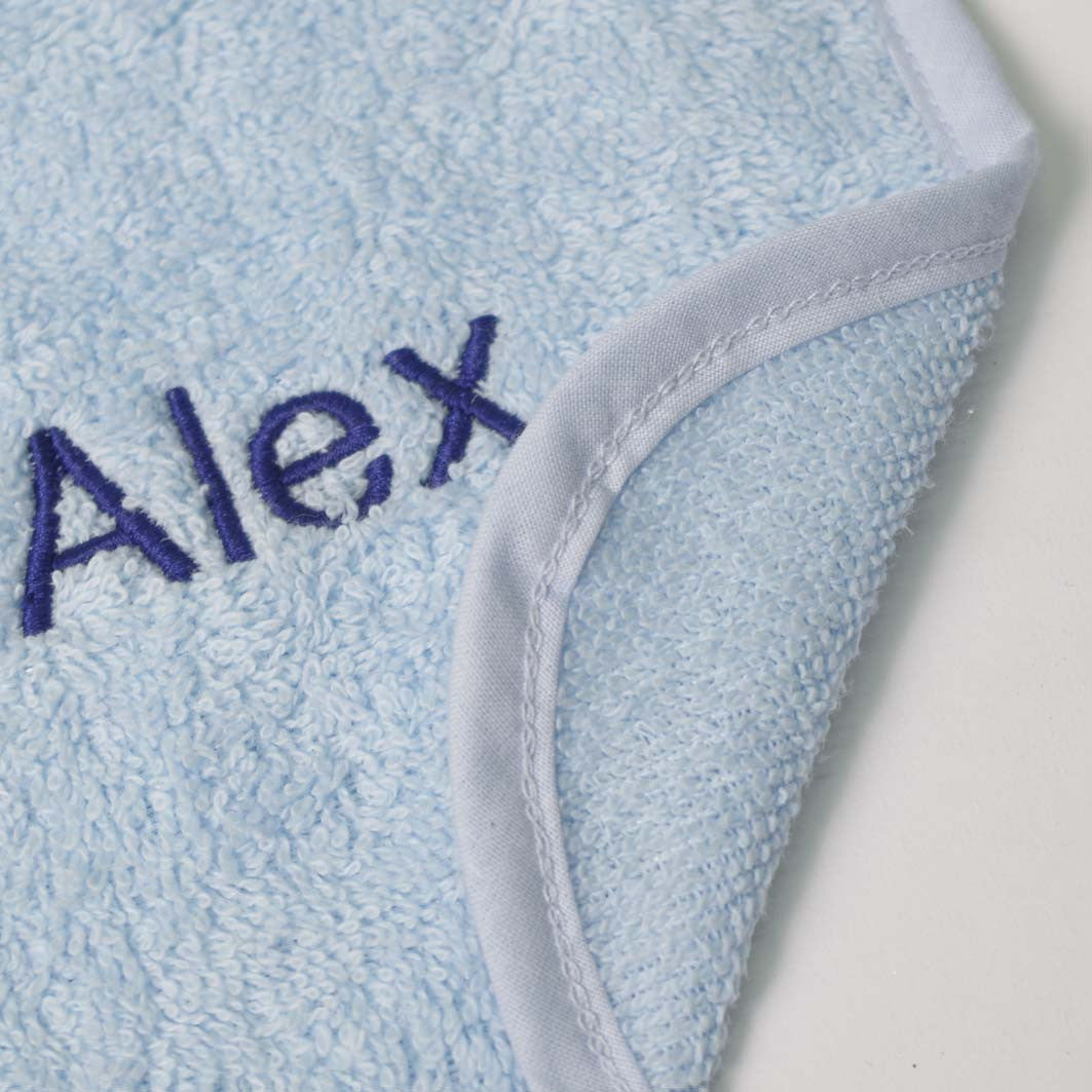 Babete atoalhado de cor sólida personalizado com nome bordado com letra minúscula estilo Helvetica com inicial maiúscula.