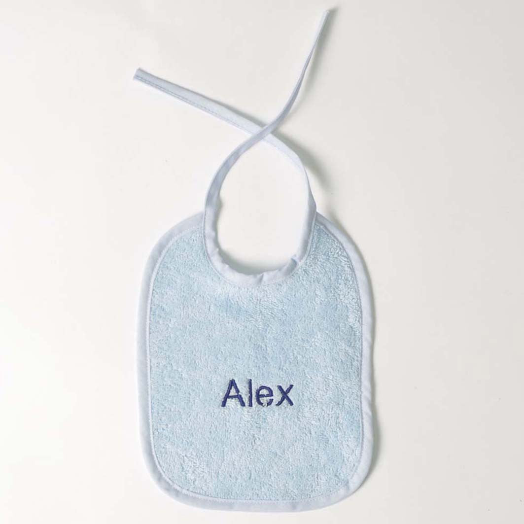Babete de rizo em cor lisa personalizado com o nome bordado em letra estilo Helvetica minúscula com inicial maiúscula.