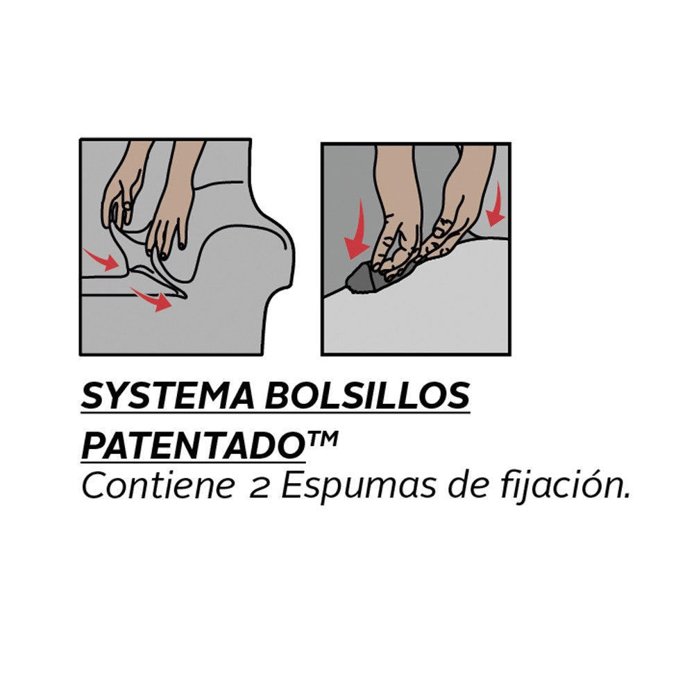 Sistema de fácil colocação para colocá-la sem desmontar as almofadas, com 2 espumas de fixação.
