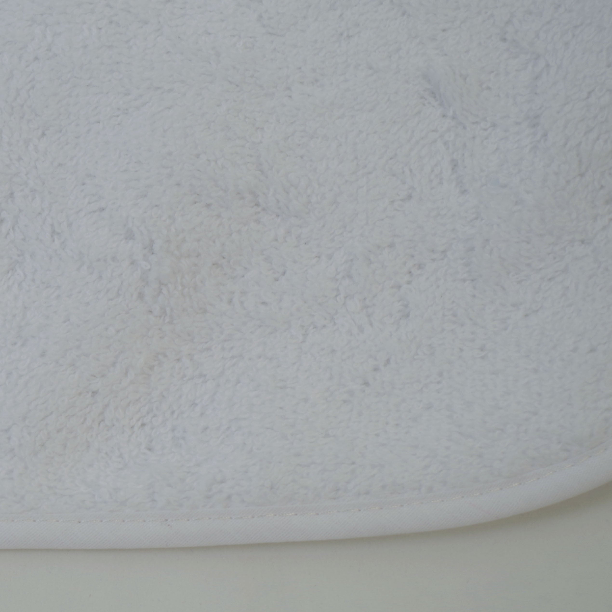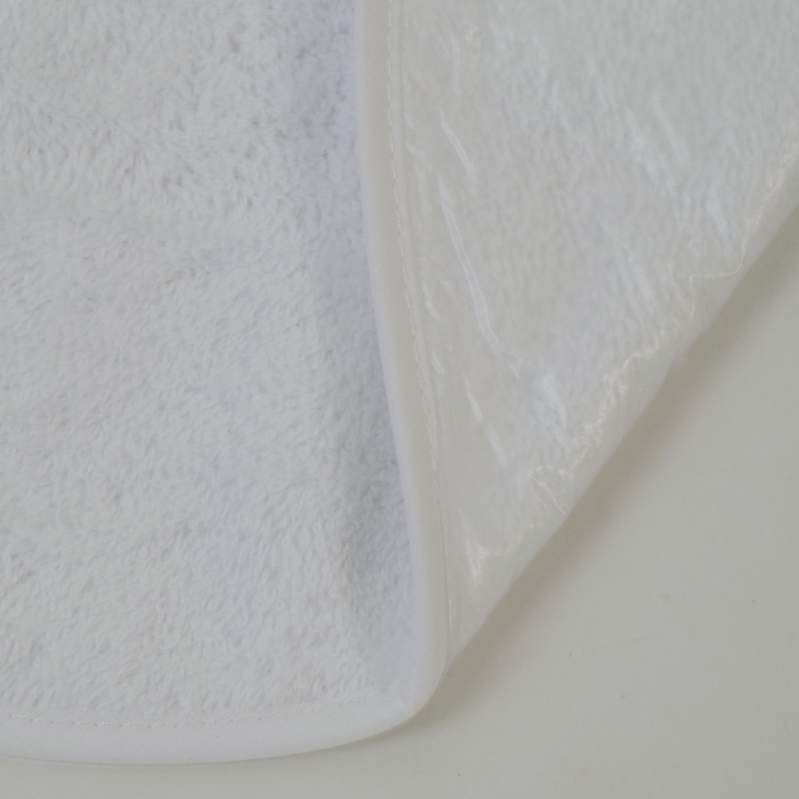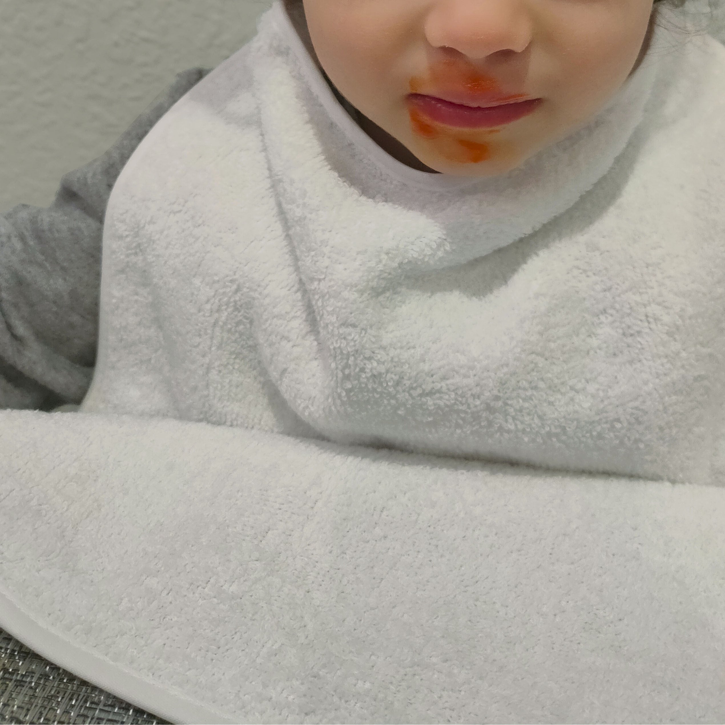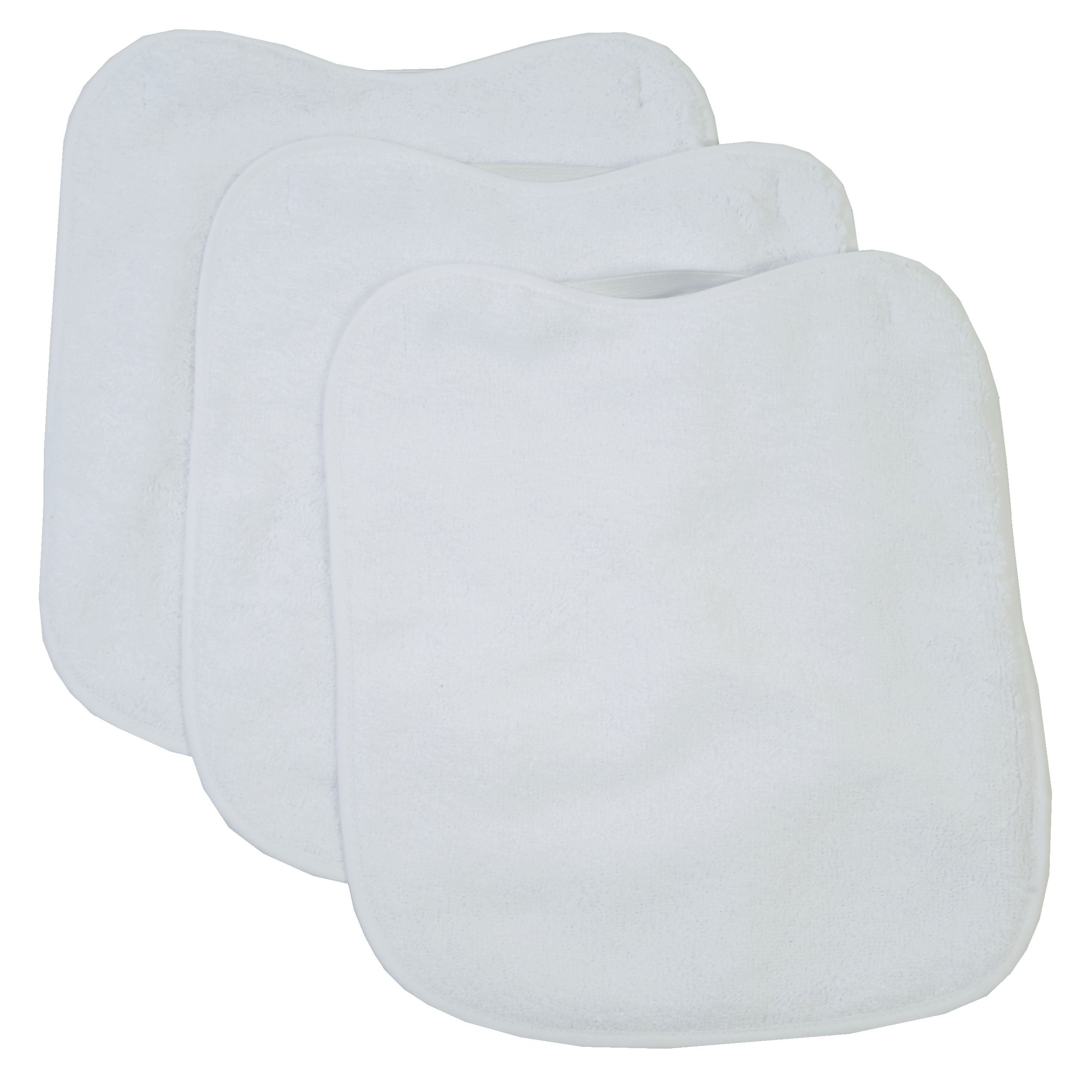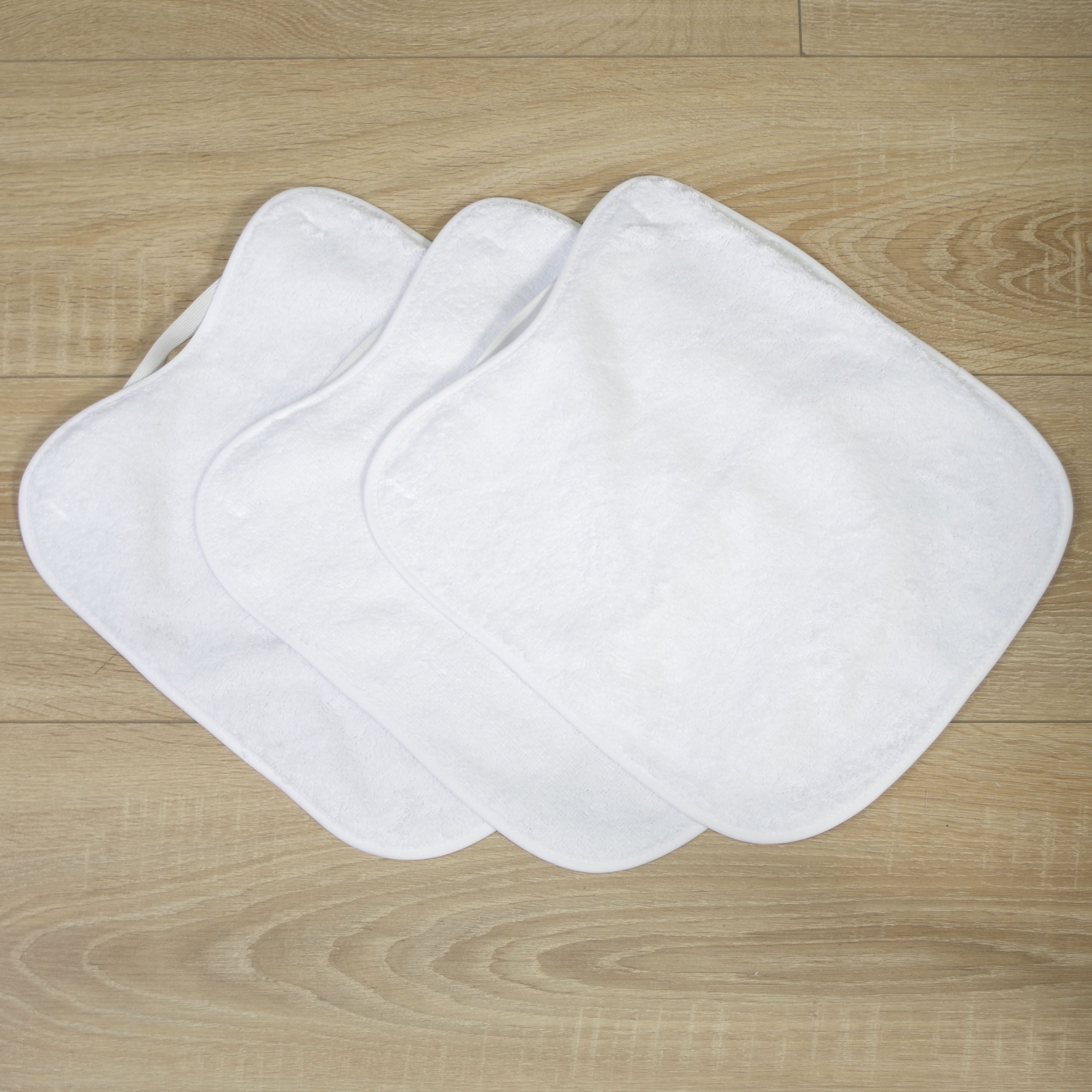 Pacote com 3 babadores de tecido atoalhado branco com elástico. Exterior em tecido felpudo lavável e parte traseira à prova d'ág
