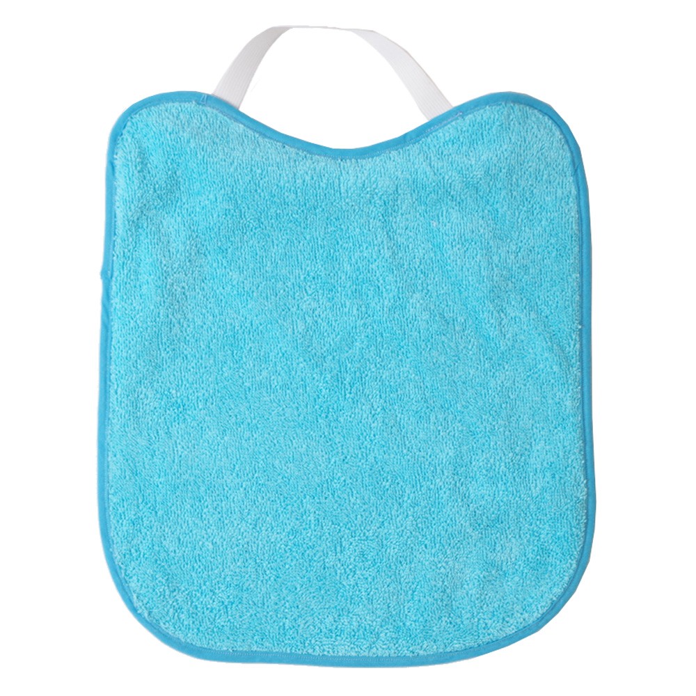 Pack de 3 babadores em tecido atoalhado azul turquesa, forro de plástico e elástico na gola.