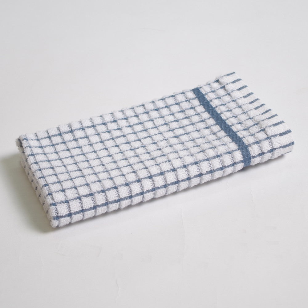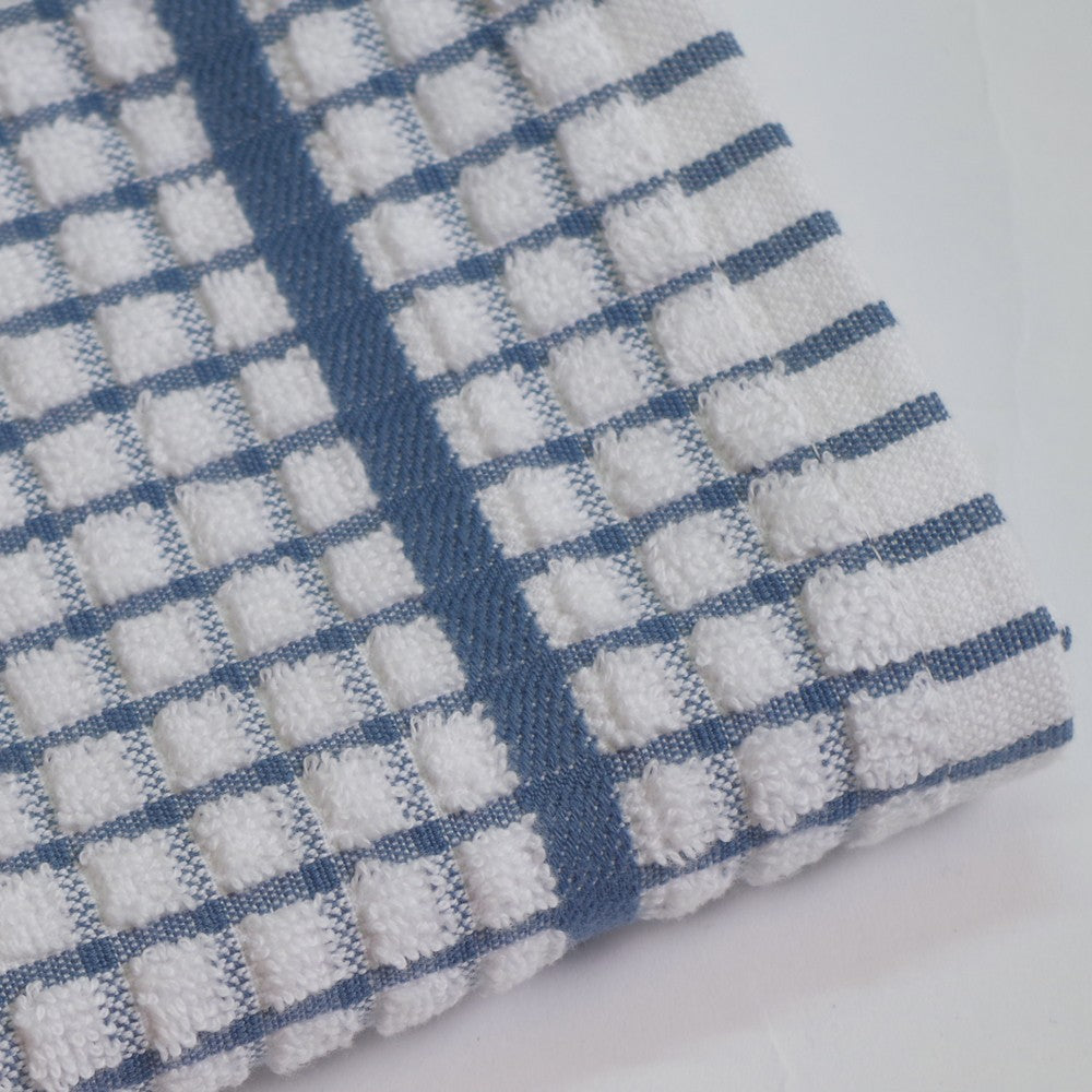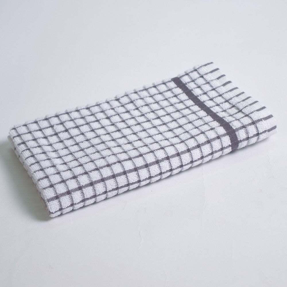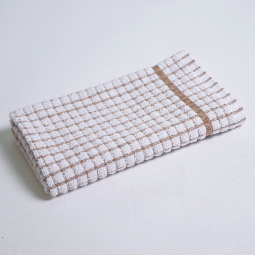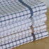 Um pano de cozinha de rizo com jacquard a fazer quadrados bicolor.