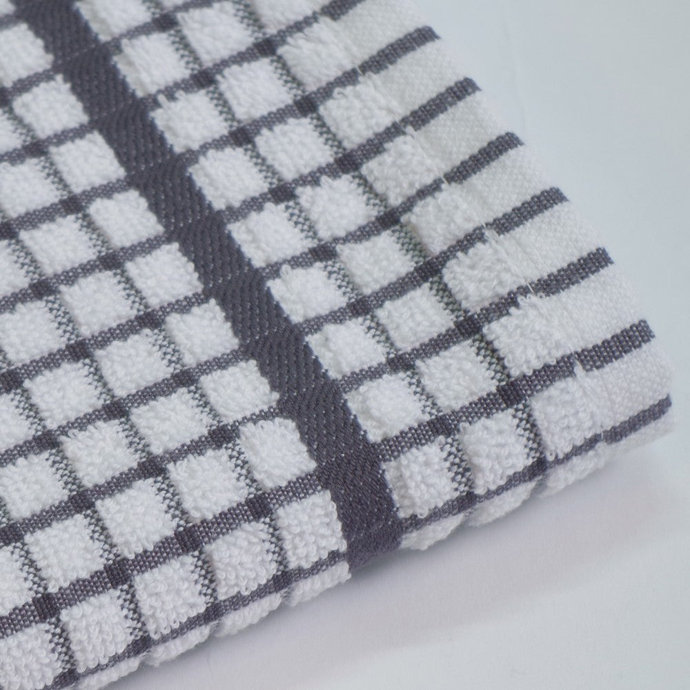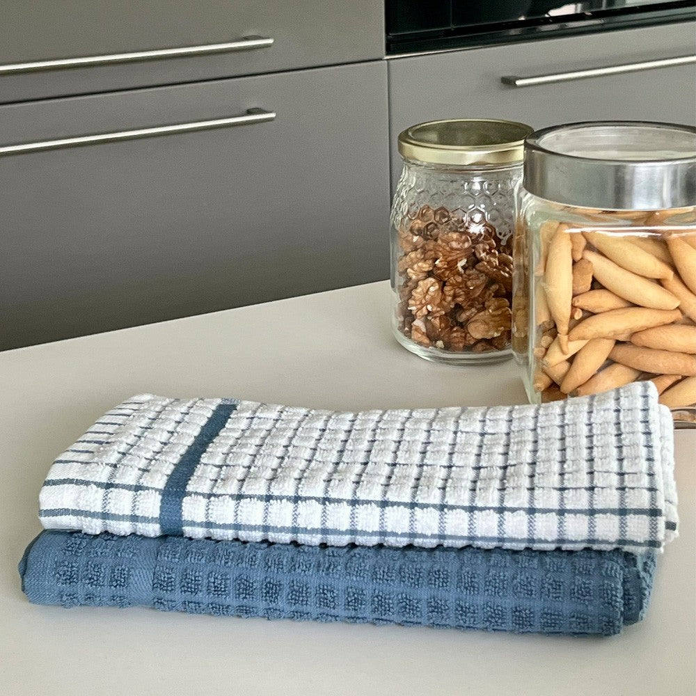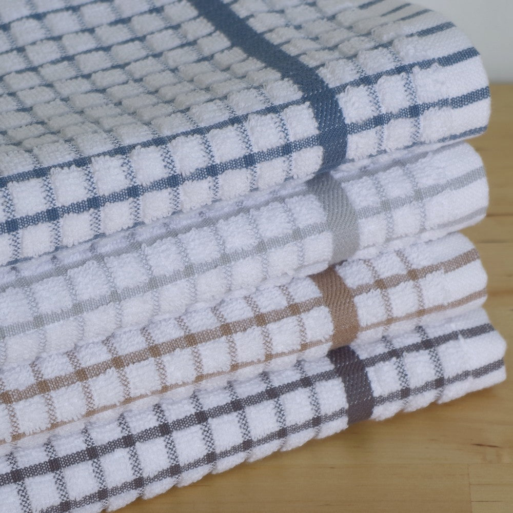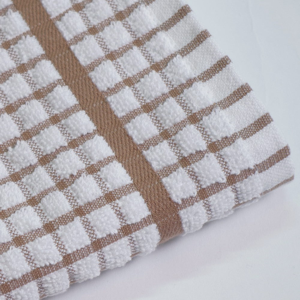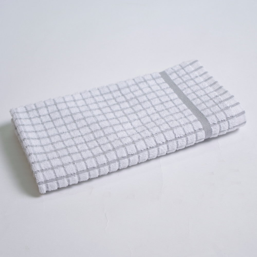 Um pano de cozinha de rizo com jacquard a fazer quadrados bicolor.