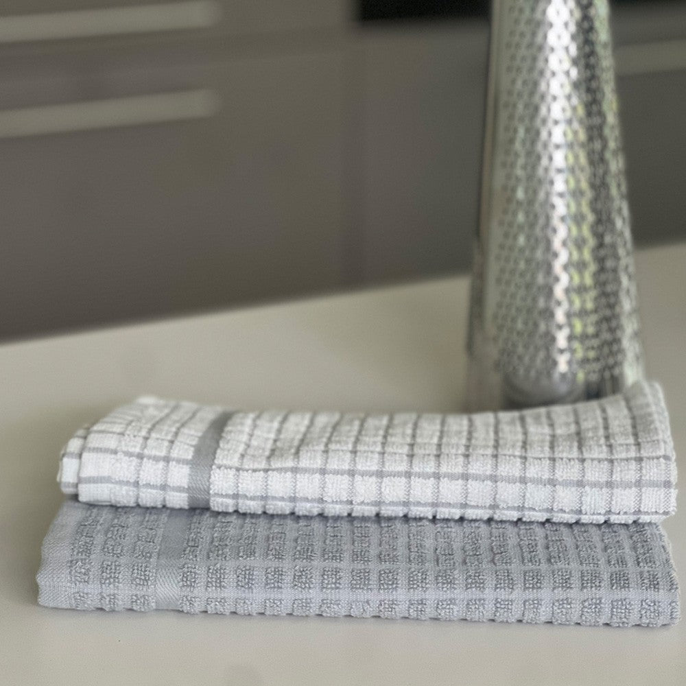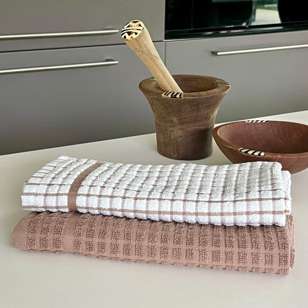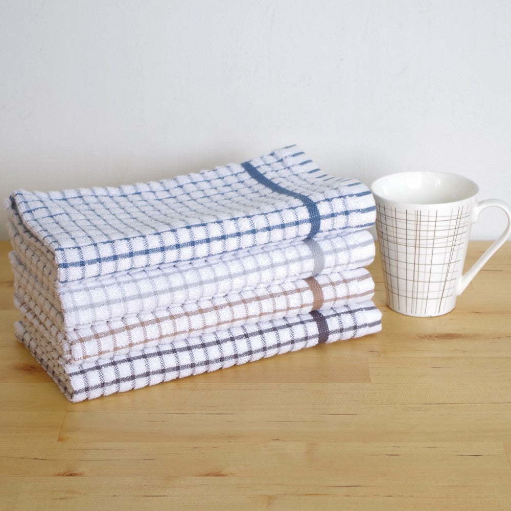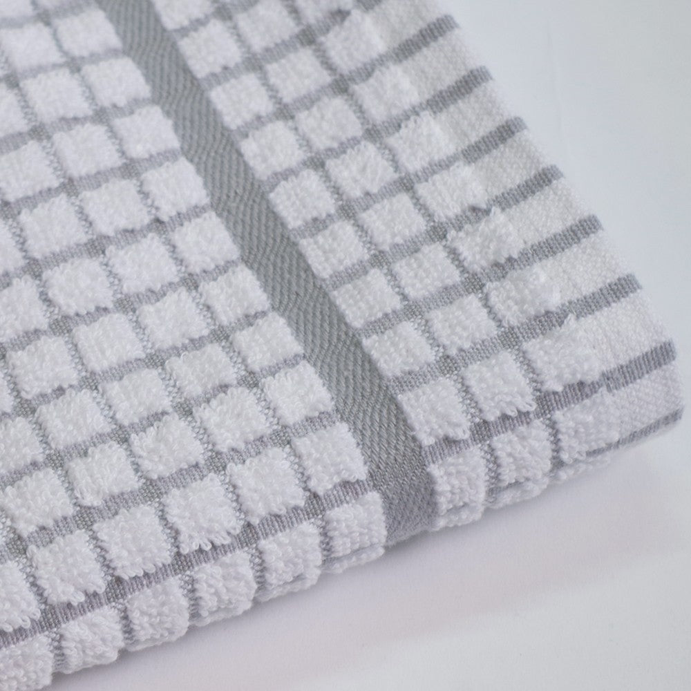 Um pano de cozinha de rizo com jacquard a fazer quadrados bicolor.