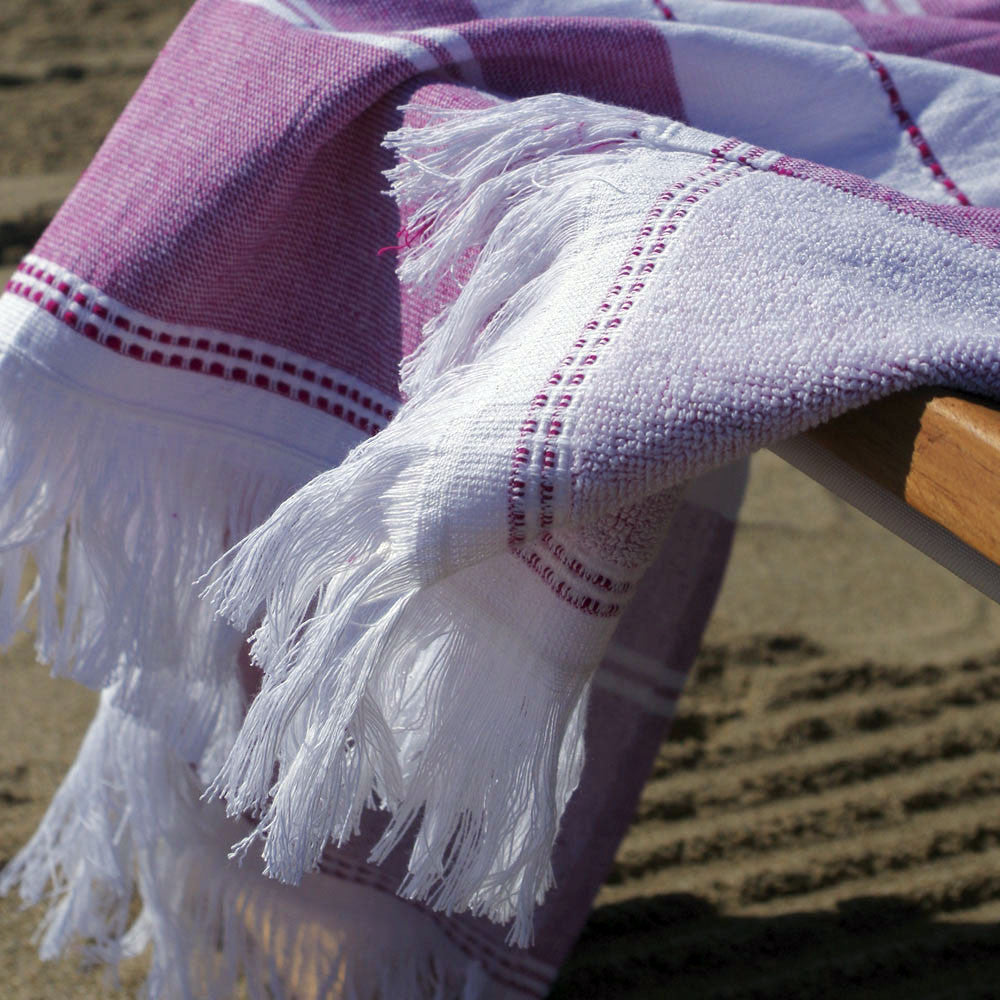 O reverso é um pano felpudo branco. Com este modelo fará inveja a todas as suas amigas na praia!