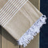 Pareo liso com detalhe de riscas bordadas e franjas nas extremidades.