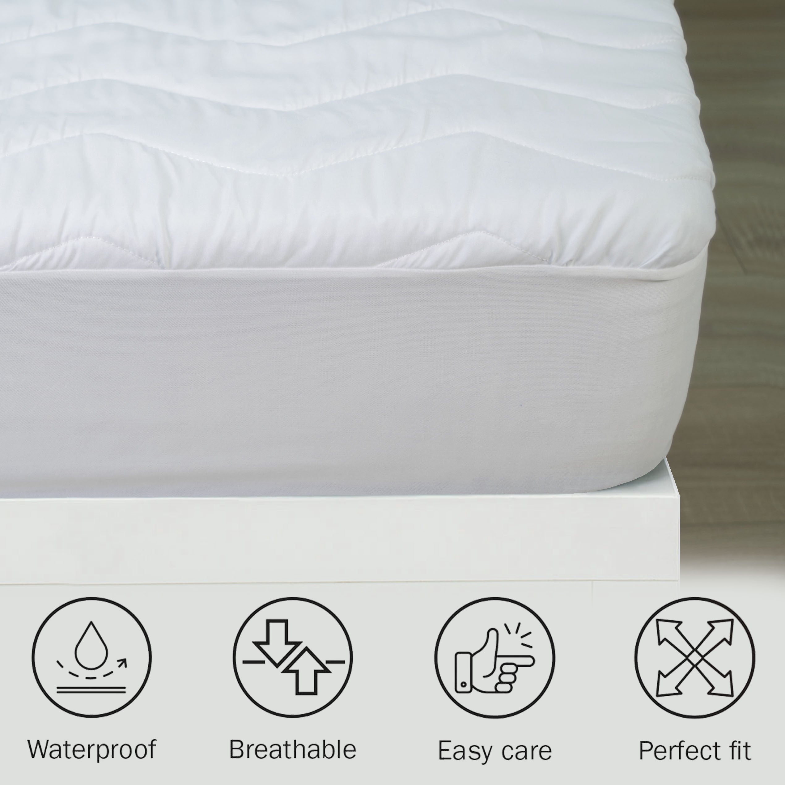 Acolchoado em tecido na parte superior, com enchimento de fibra e PU na parte do reverso, isto proporciona que seja impermeável mas respirável.