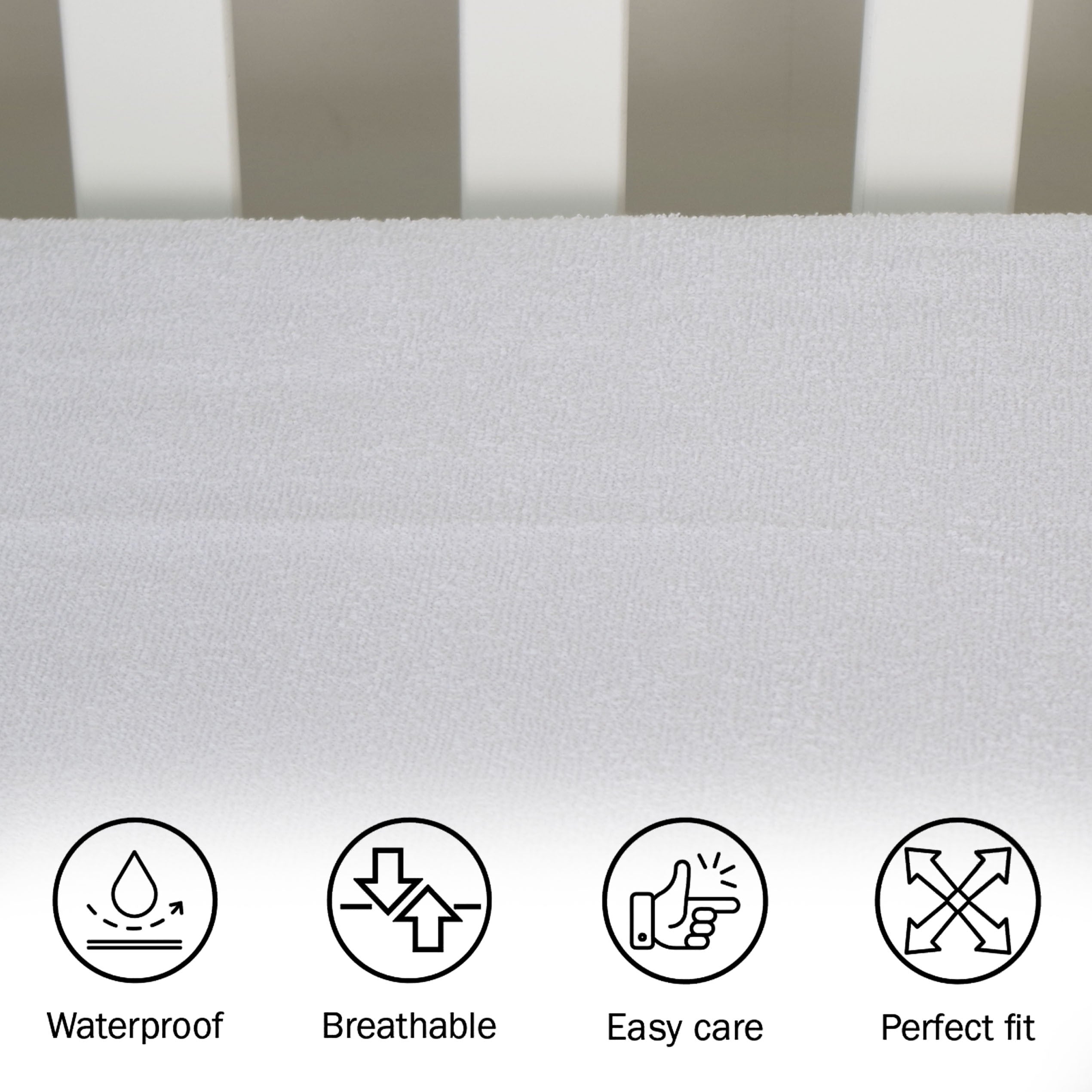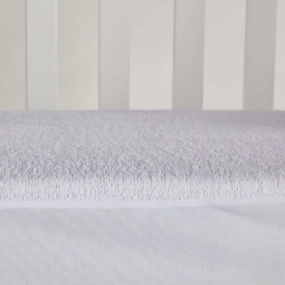Este protetor para o berço do seu filho é feito de tecido de caracol de algodão e parte traseira de poliuretano. O tecido de caracol de algodão torna seu toque macio e não irrita a pele, enquanto o dorso de poliuretano isola o colchão para que fique bem protegido de possíveis incidentes. As capas de colchão geralmente são à prova d'água, mas esse protetor, além de ter esse recurso essencial, também é respirável.