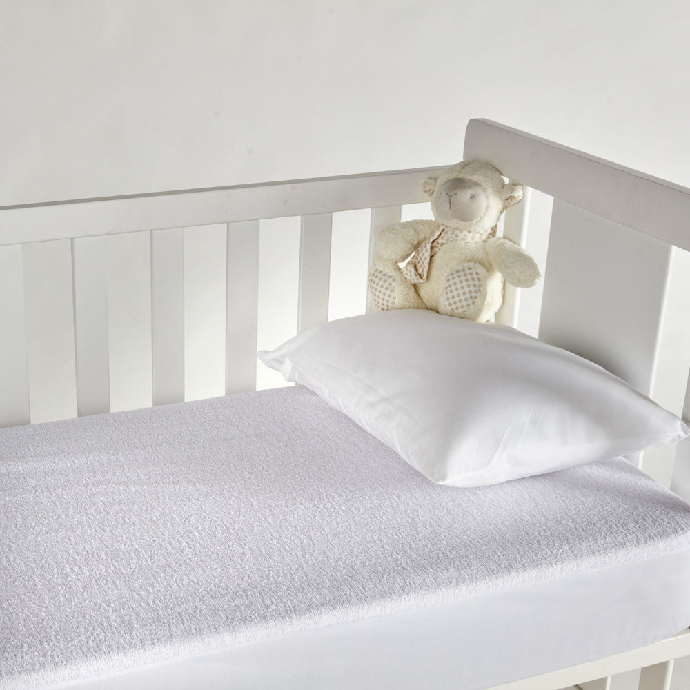 Protetor para berço de várias medidas. Tecido em felpa de algodão e reverso em poliuretano. É impermeável e respirável. Adapta-se com um elástico ajustável ao colchão. Para colchões de altura máxima de 16 cm.