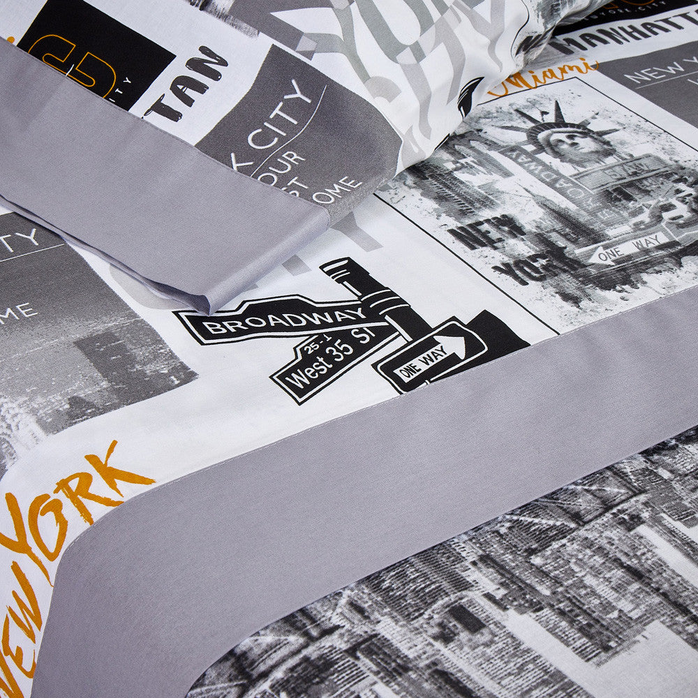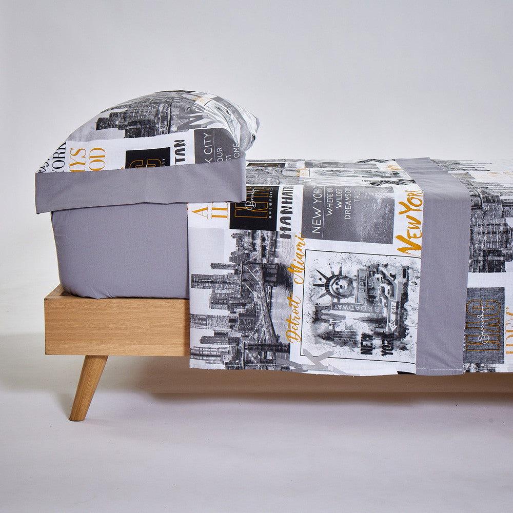 O conjunto é composto por lençol superior estampado, lençol ajustável liso e fronha estampada com duas aberturas.