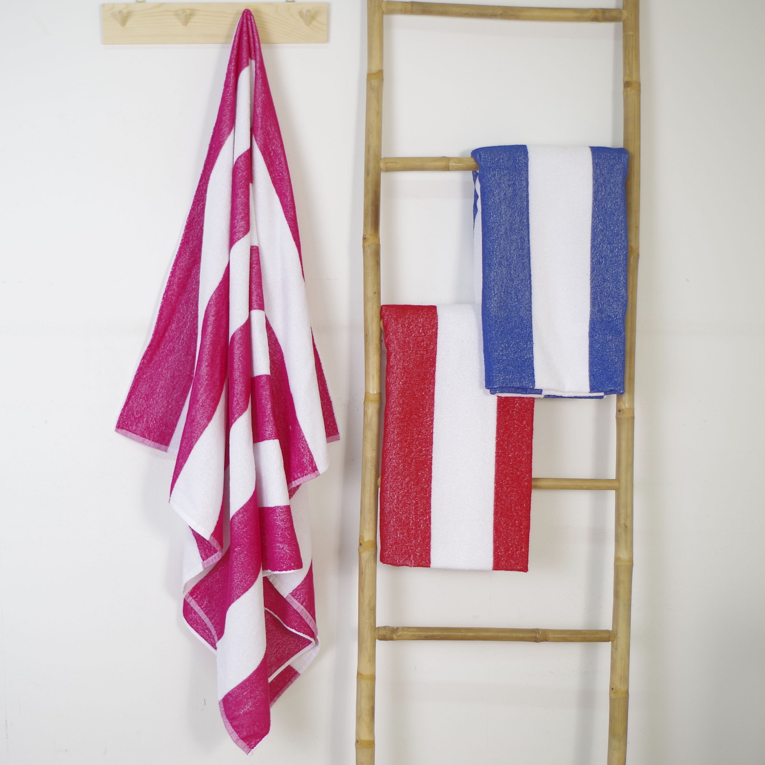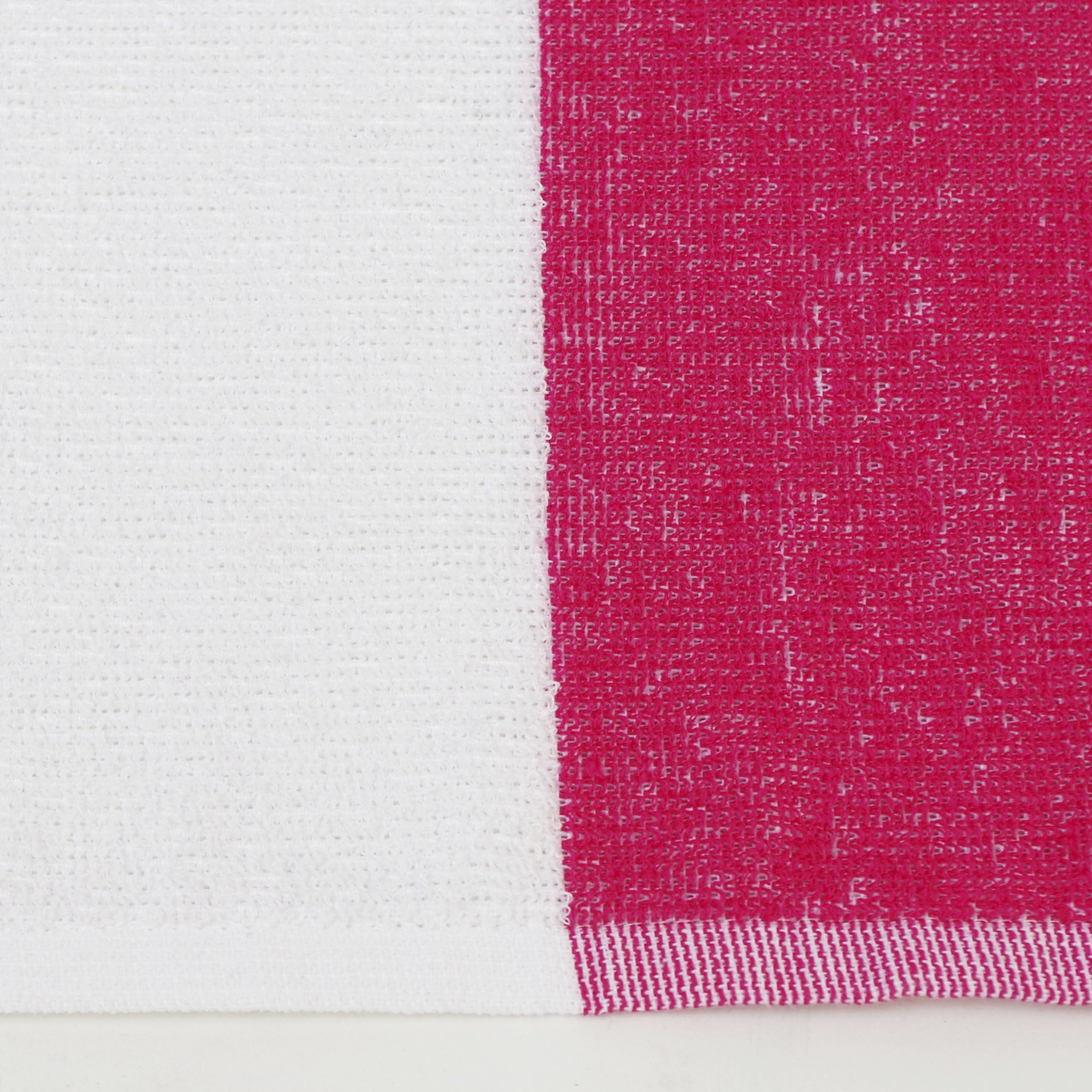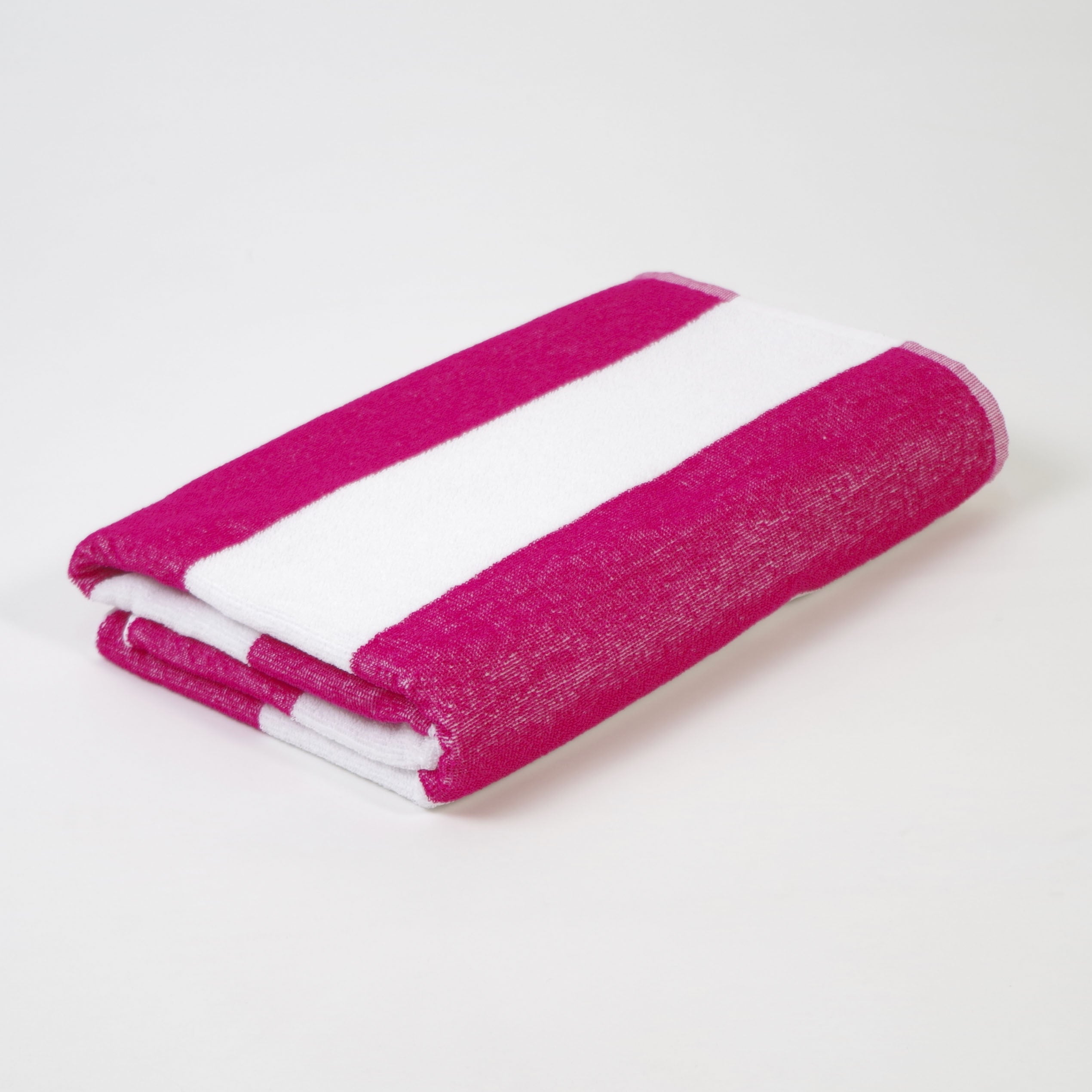 Toalhas de praia de felpo com riscas fúcsia e branco.